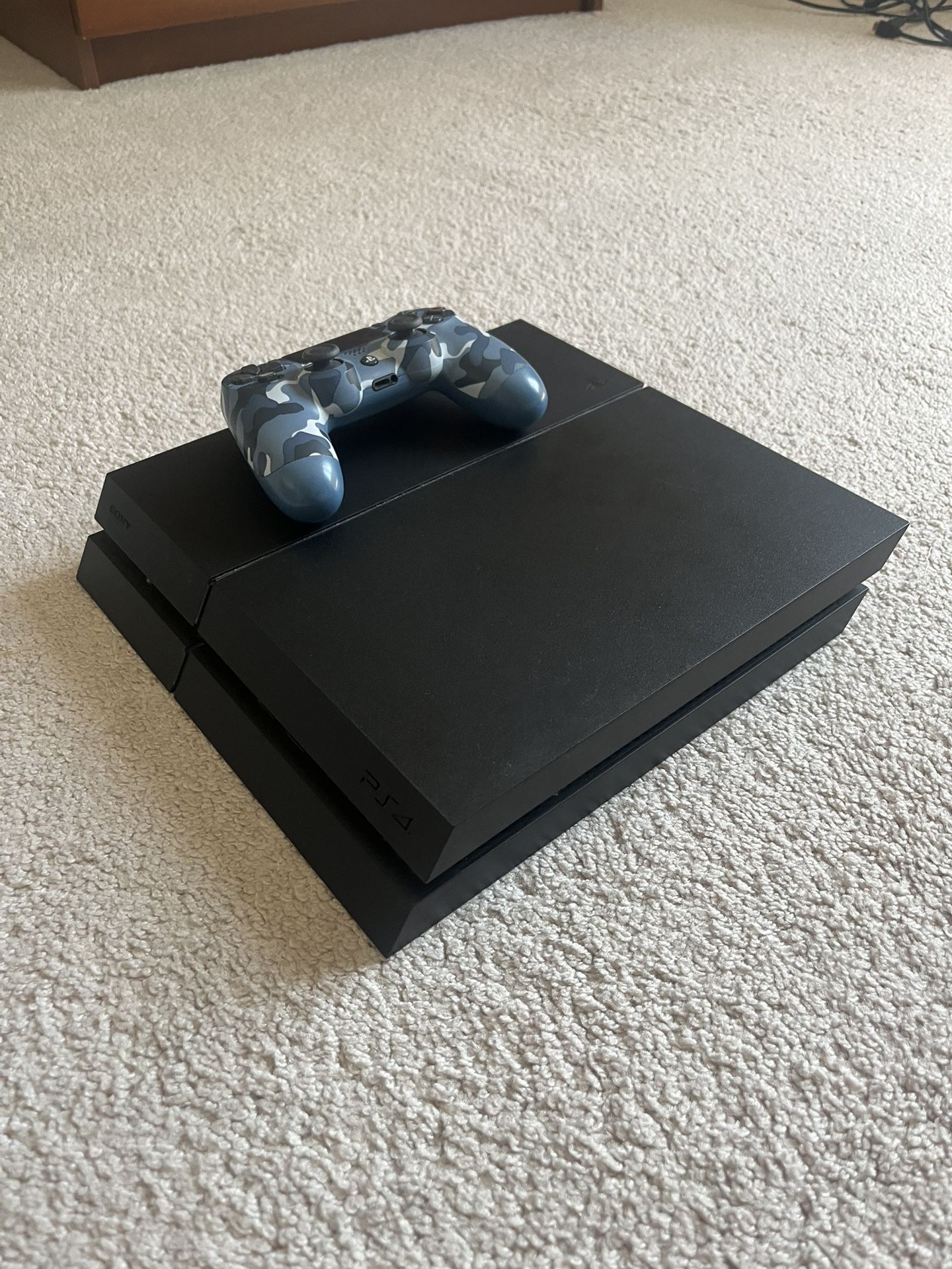 PS4 in good condition with one blue camo controller and seven games including -Call of Duty Advanced Warfare -Battlefield Hardline -Lego Jurassic World -Madden 20 -The Crew -Star Wars Battlefront -Call of Duty Modern Warfare Selling to save up for a motorcycle