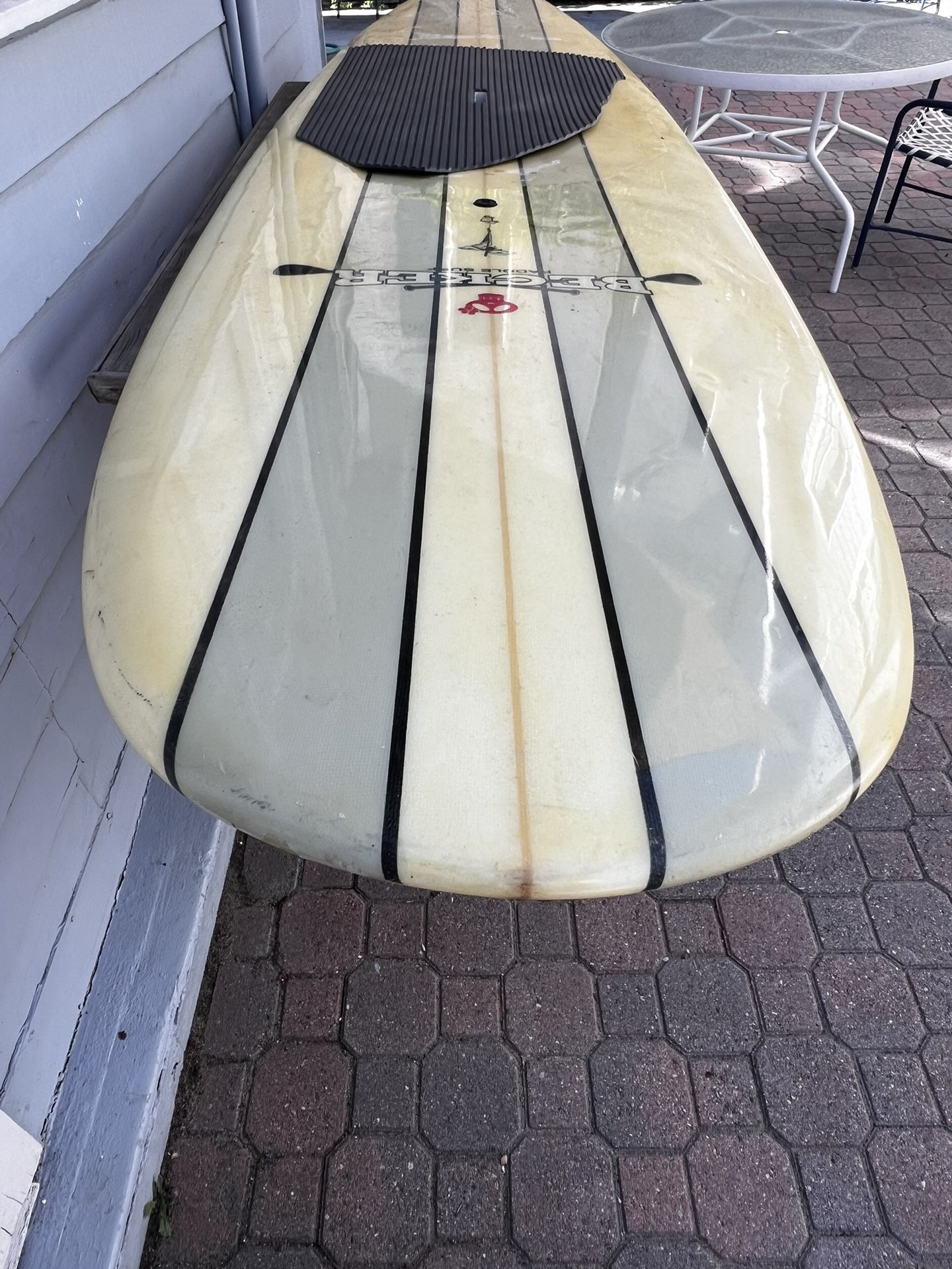 Located in its birthplace, Hermosa Beach. I can deliver but you should really check it out. Fiberglass and foam. Probably Clark Foam. TOO MUCH STYLE! The top pad was coming off a little bit so I tried to take it off but then the front half was still functional so it’s kind of ugly. Wasn’t sure of the correct solvent to use to get the whole thing off so it is as is. Contact me with any questions at anytime.