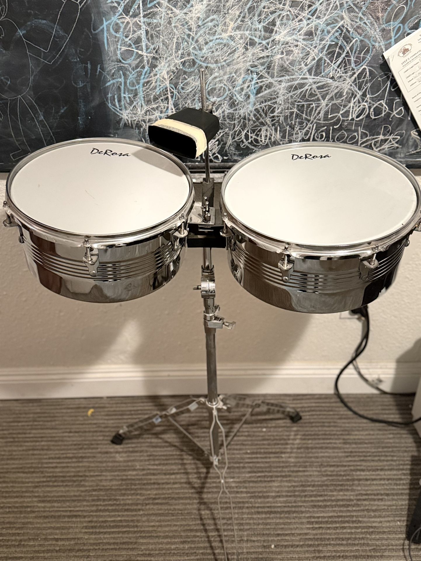 Used De Rosa Timbales Set with Cow Bell, Stand and drum sticks. Ready for pick up. Bought on Amazon for $100