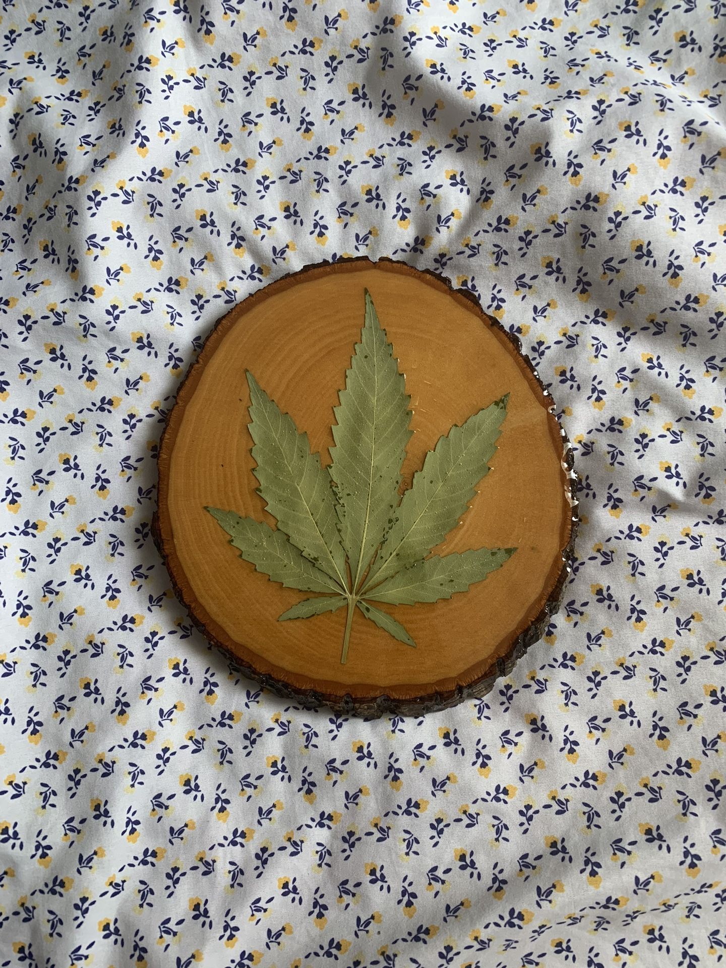 Genuine home made weed leaf on a cut of wood covered in resin. Great decoration to hang up in your kitchen, bedrooms, and bathrooms