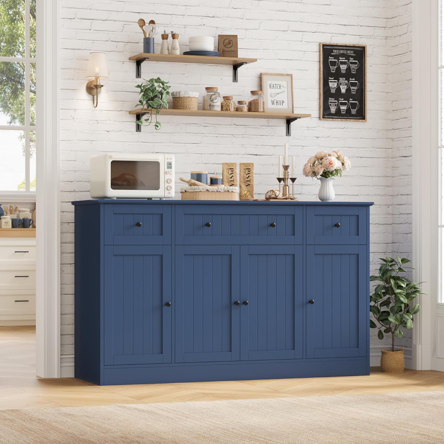Modern Minimalist Charm: Adorned with sleek blue finish and crisp strip that harmonize with black knobs, this modern sideboard exudes elegance to glam up your space. And its chic profile for a refreshing coastal feel, which seamlessly match your beach theme Ample Storage Space: Equipped with 3 handy drawers and 55'' wide tabletop for tableware and often-used appliances, 3 storage cabinets with shelves and doors for dishes, microwave , etc. , the large kitchen buffet sideboard can perfectly solve the messy storage dilemma in your home Crafted To Last: Carefully crafted with high-grade MDF and waterproof painted body, this dining room cabinet boasts long-lasting durability. The reinforced structure and anti-tip devices further enhance its stability, Overall size:15.7"D x 55.1"W x 31.7"H Multi-Purpose Buffet: Perfect as a chic kitchen storage cabinet, a stylish coffee bar cabinet, a sleek sideboard buffet cabinet or TV stand in dining room and living room, this versatile piece can effortlessly upgrade your space and fulfill your storage needs HOS-MD-135