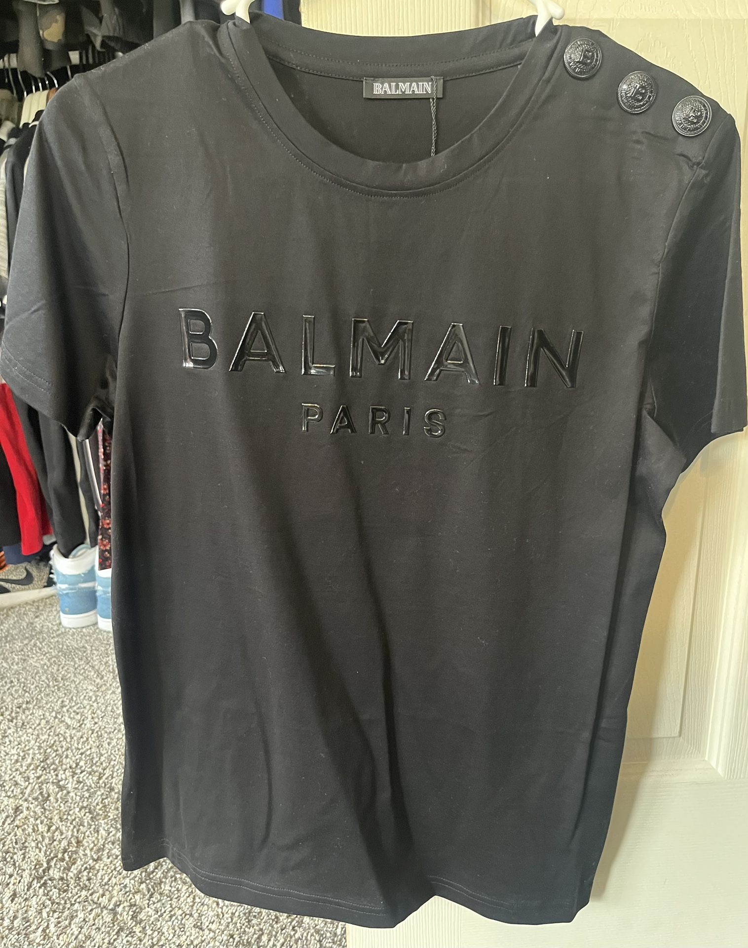 Balmain Paris Print t-shirt. Brand new- never worn. Tags attached. Relaxed fit Round neck with ribbed trim 3 decorative embossed metal buttons on the shoulder Short sleeves Balmain Paris logo printed on the front Model measures 179cm and wears a size S Material: 100% cotton