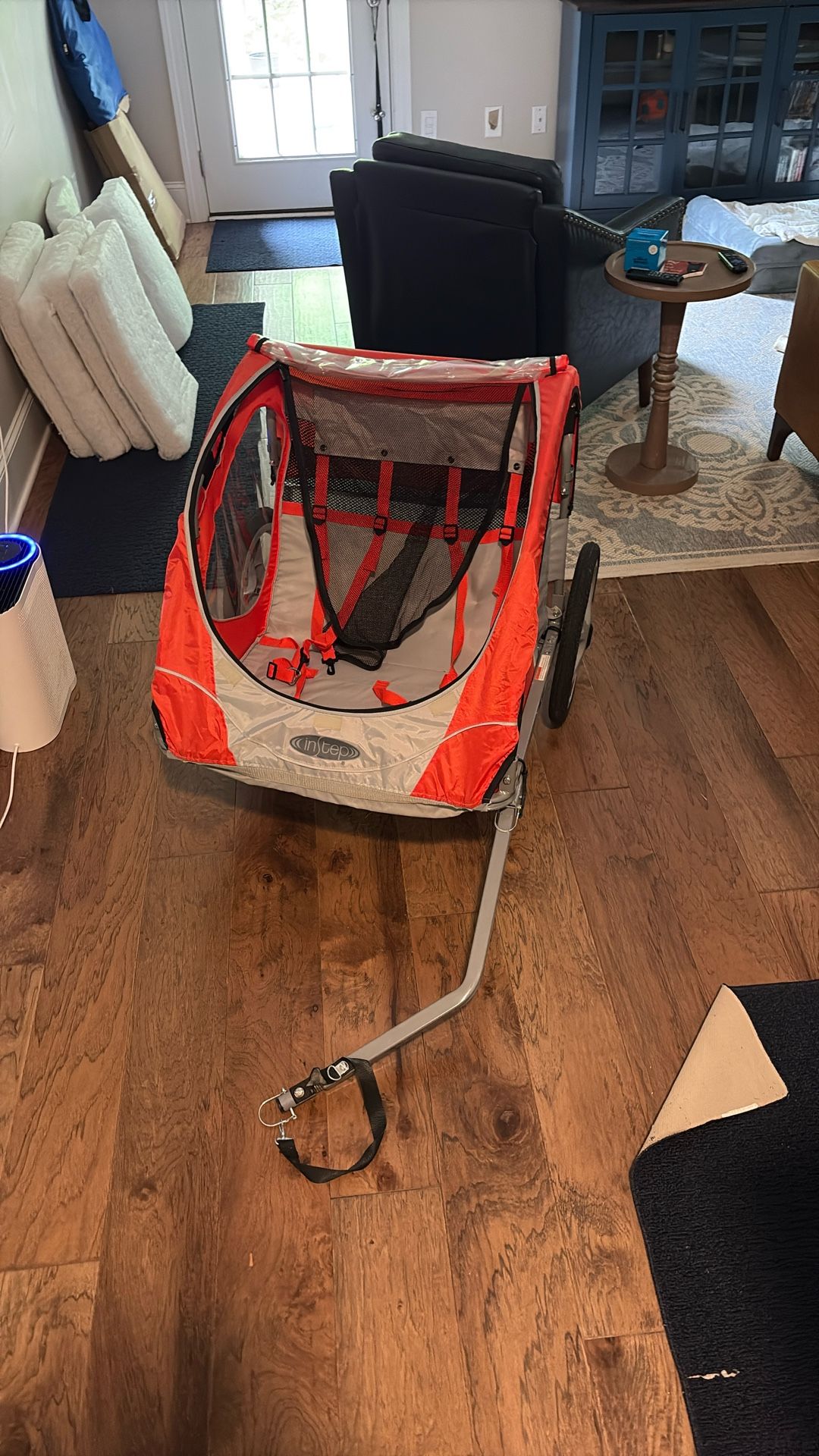 Two seats and buckles Net and rain shield Removable tires and collapsible hitch