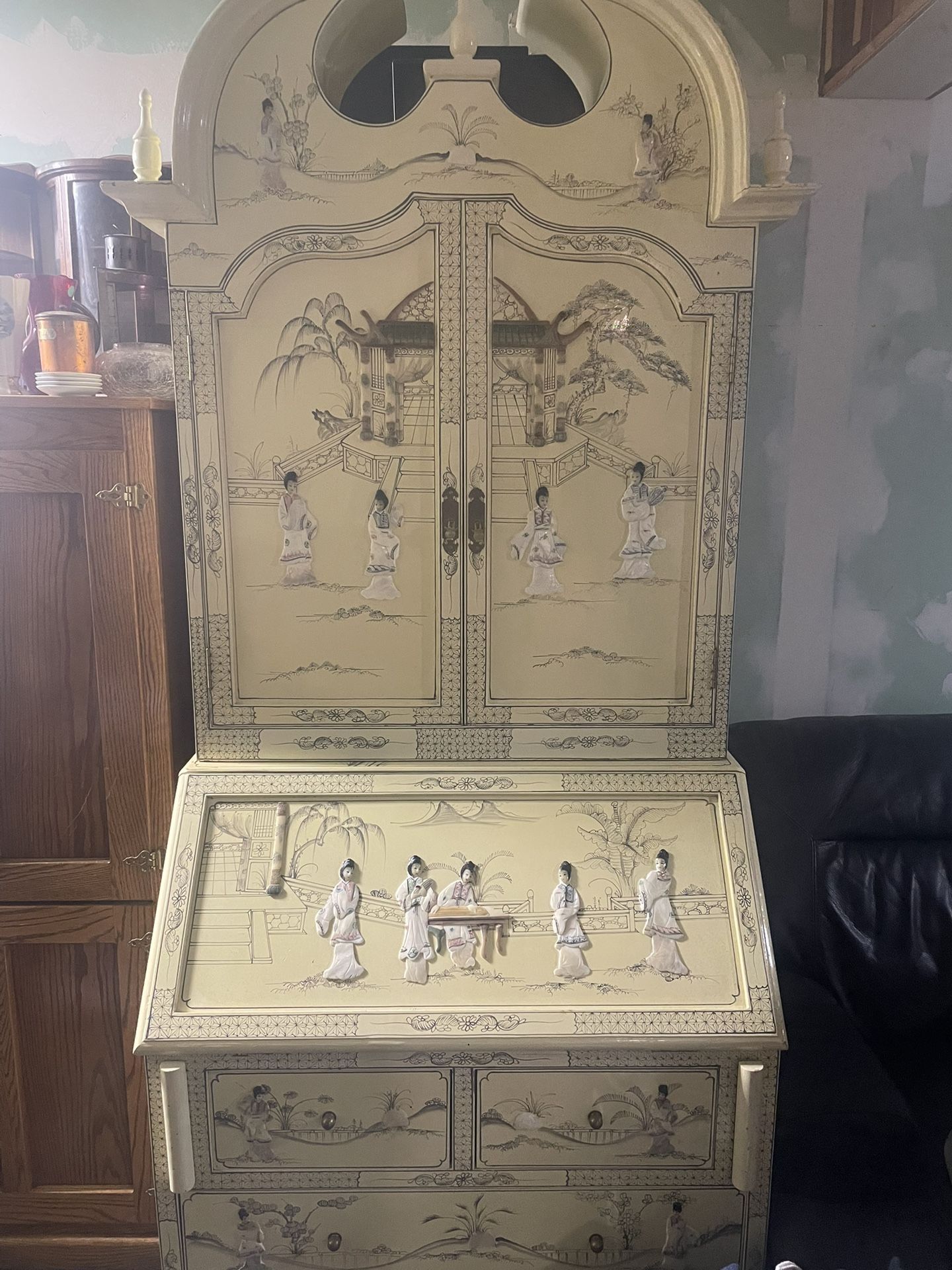 2 piece Vintage mother of pearl Asian cabinet Drawers lined with beautiful green velvet material Top cabinet: 450 Bottom cabinet:450 Entire cabinet: 900