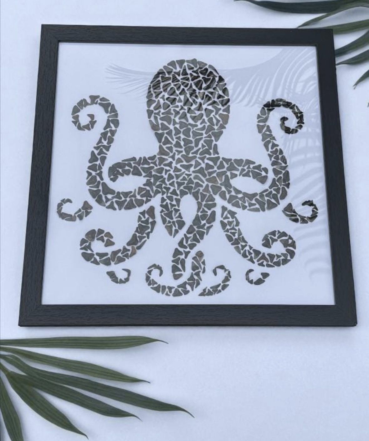 Original. Local Artist. “Tooth & Tentacle" Handmade Shark Tooth Fossil Octopus Wall Art – 12” x 12”