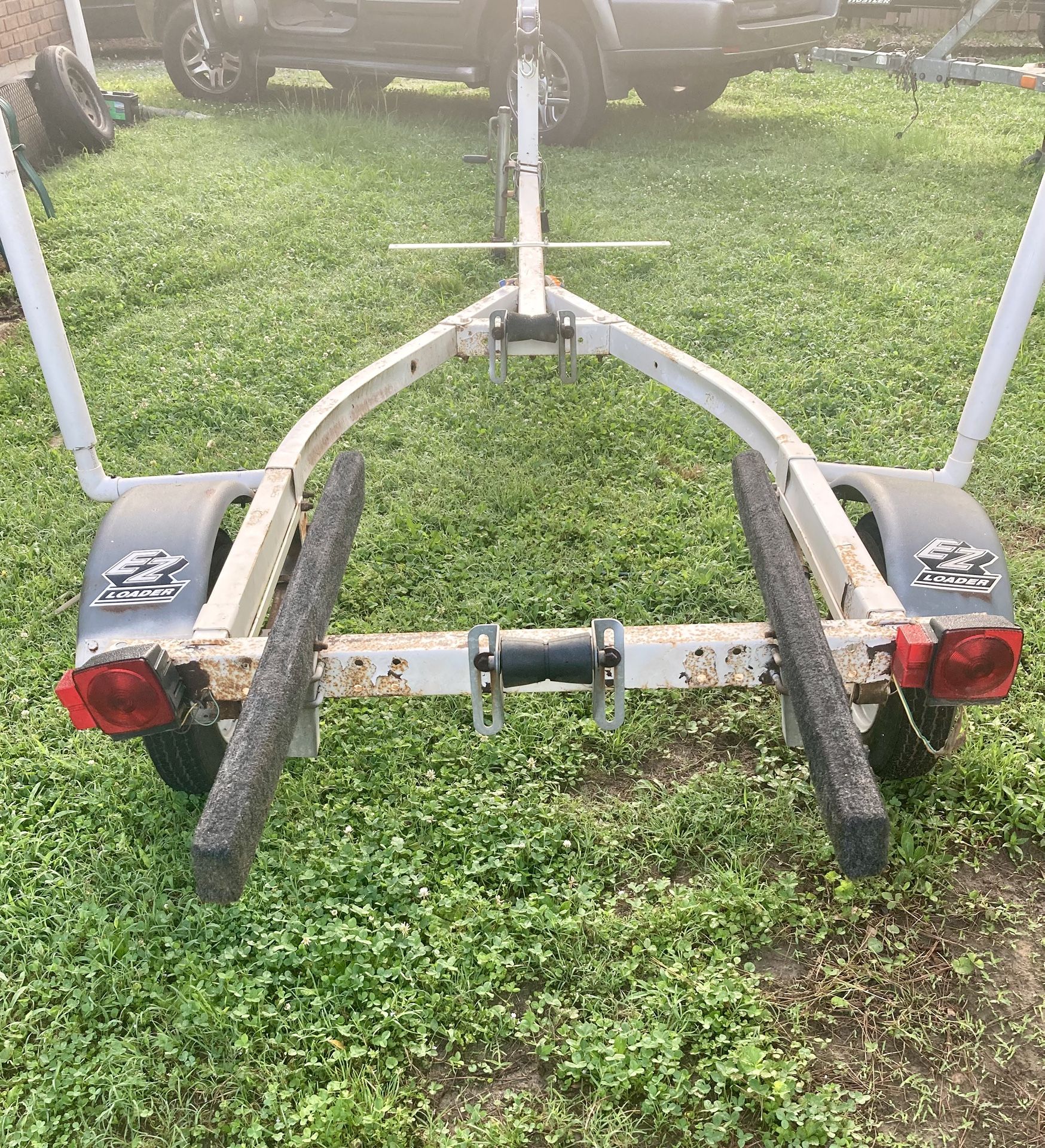 Trailer for a small boat or jetski is a total of 15 feet in length, 43 inches wide from the outside of the frame, and 30 inches wide from the outside of the bunks. Bunks are adjustable as well as the bow stop. It has a good jack, good winch, good tires and axle, working lights, and is ready for the road.
