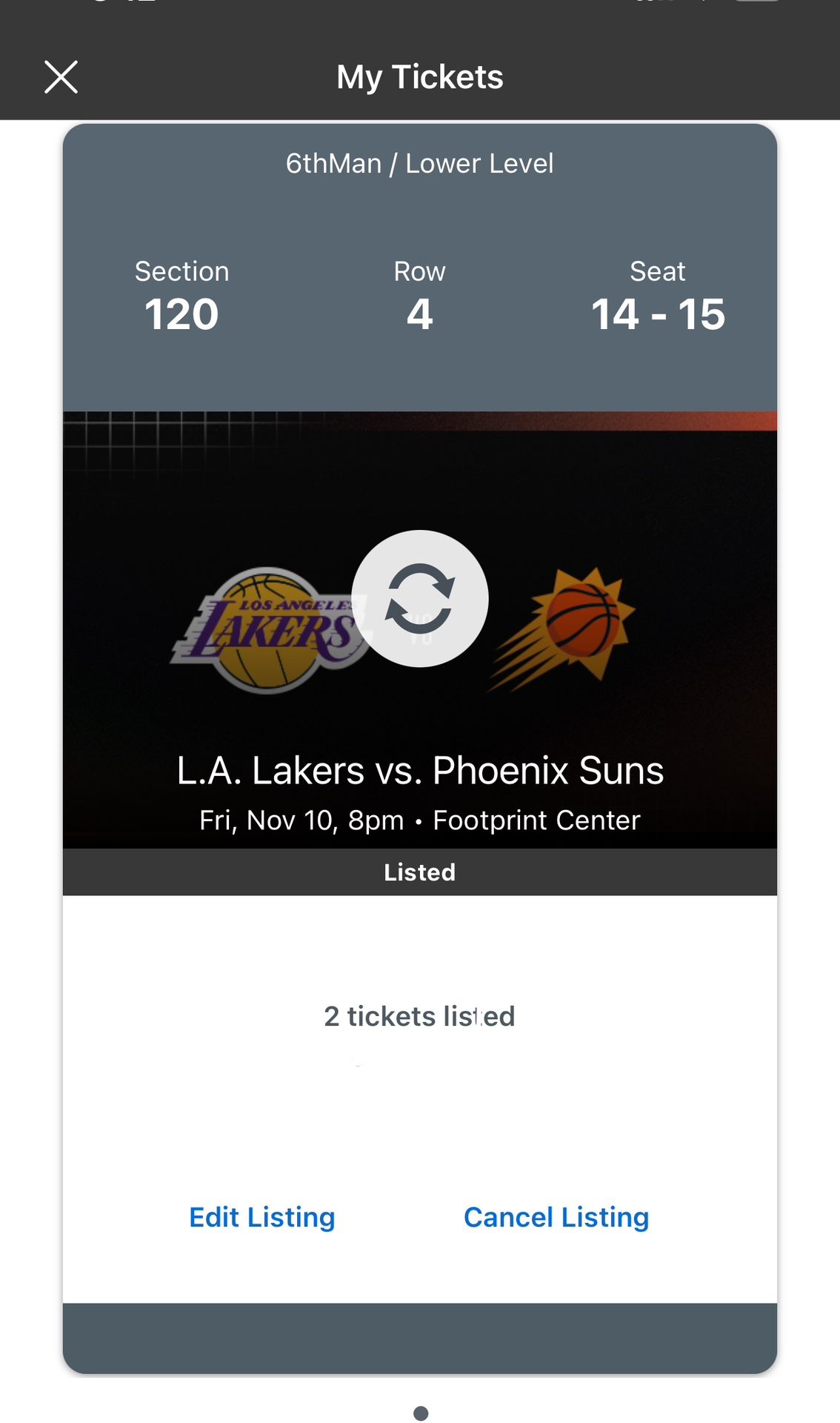 Selling Suns vs Lakers tickets for this Friday ! Sec. 120 row 4 seats 14&15 - $500 each ticket ! Won’t find them cheaper for the seats ! right by the tunnel with a great opportunity of getting autograph ! Once doors open at 5 that would be your chance. I am season ticket holder and a trusted seller ! Can meet location for safe transaction !