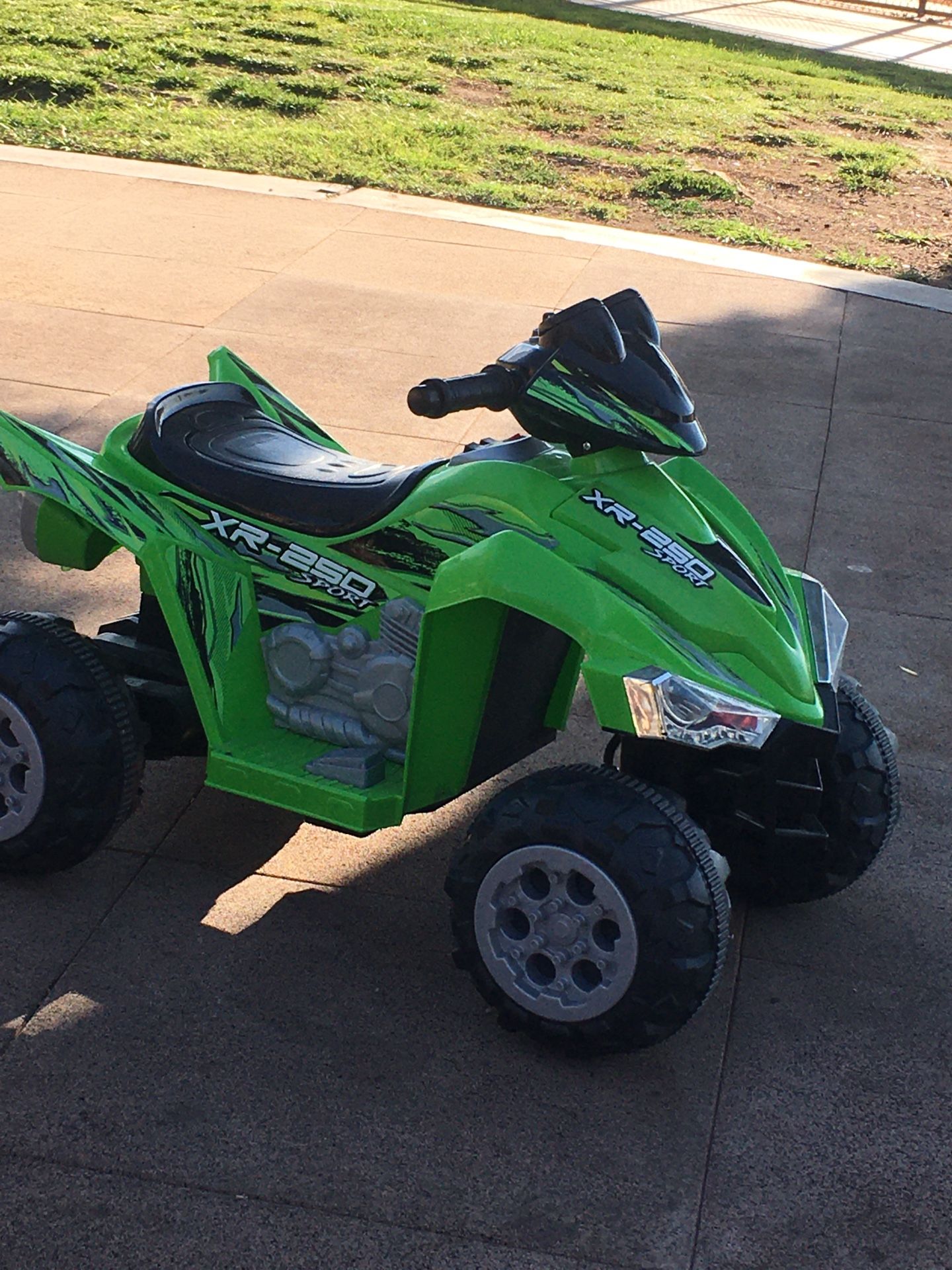 Toy quad with charger lights turn on as well make some sounds like a moto and hunks too and has reversed Easy to use Battery as well is each charge last long time