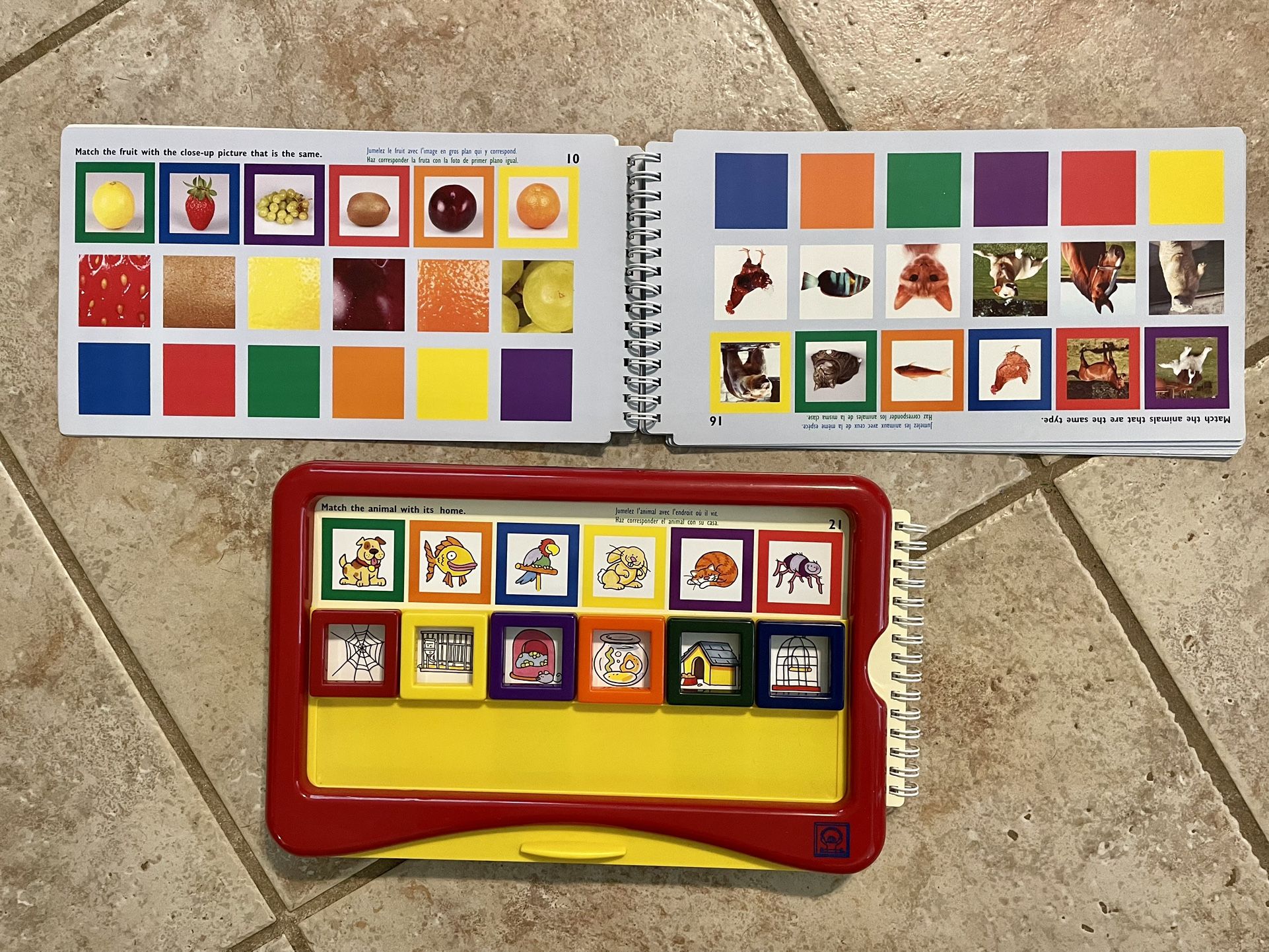 Self-checking learning system designed exclusively for preschoolers. Snap the colored frames onto the answers, then pull down the tray to check the results. If the color of the frame and square are the same, it's a match! 2 card sets store in back of the Match Board. 24 activity pages per card set. Match Board 11" x 1.13" x 7"/ 27.9 x 2.9 x 17.8cm.Trilingual. (English, French, Spanish). Includes: Match Board Level 1 card set Level 2 card set from 3 y – kindergarten Benefits: Easy-to-use self-correcting system gives the child more control of the learning experience, building confidence and self-esteem. Child can progress at own pace. Combining kinesthetic and visual learning will help to reinforce the connections formed in the child's brain. Builds fundamental skills for future test-taking. Strengthens observation and concentration skills. Level 1 card set promotes reading readiness: Visual discrimination of objects Matching Visual associations Complete activities left to right Level 2 card set promotes early math concepts & builds logic and critical thinking: Numeral & quantity identification Matching Visual associations Sets Halves to Whole Promotes early problem-solving. Card sets are numbered for progressive learning. Awards: iParenting Media Award CFCN Toy Test Winner (Calgary Toy Review) Great American Toy Test NAPPA Gold Award ( National Parenting Publications Awards)