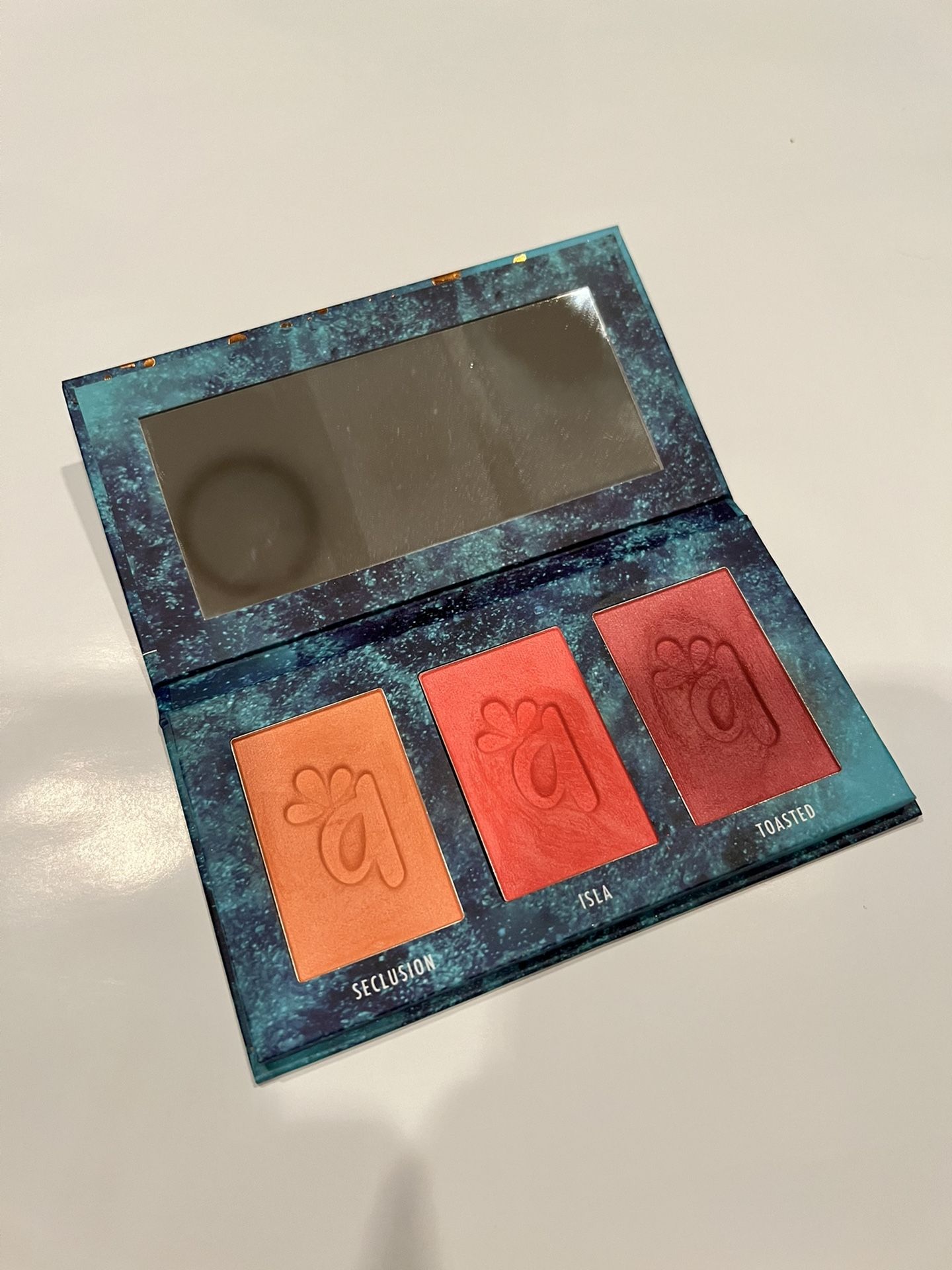 very lightly swatched Alamar Cosmetics Colorete Blush Trio: MEDIUM/TAN Seclusion Isla Toasted Our Colorete blush trios are a curated collection of 3 blushes designed to complement your skin tone. Get the sun kissed, radiant, and flushed look a hot day at the beach would give you, but with none of the damage to your skin. Our Colorete blush trios are formulated to glide seamlessly over your cheeks while offering maximum pigmentation. Our buttery smooth formula contain micro shimmers and are completely vegan, talc free, and cruelty free. Fragrance free! Seclusion: True as can be PEACH tropical vibes. Isla: Not your abuelita's CORAL. Toasted: a true ROSE moment. Our Colorete blush trios are formulated to glide seamlessly over your cheeks while offering maximum pigmentation. Our buttery smooth formula contain micro shimmers and are completely vegan, talc free, and cruelty free. Fragrance free!