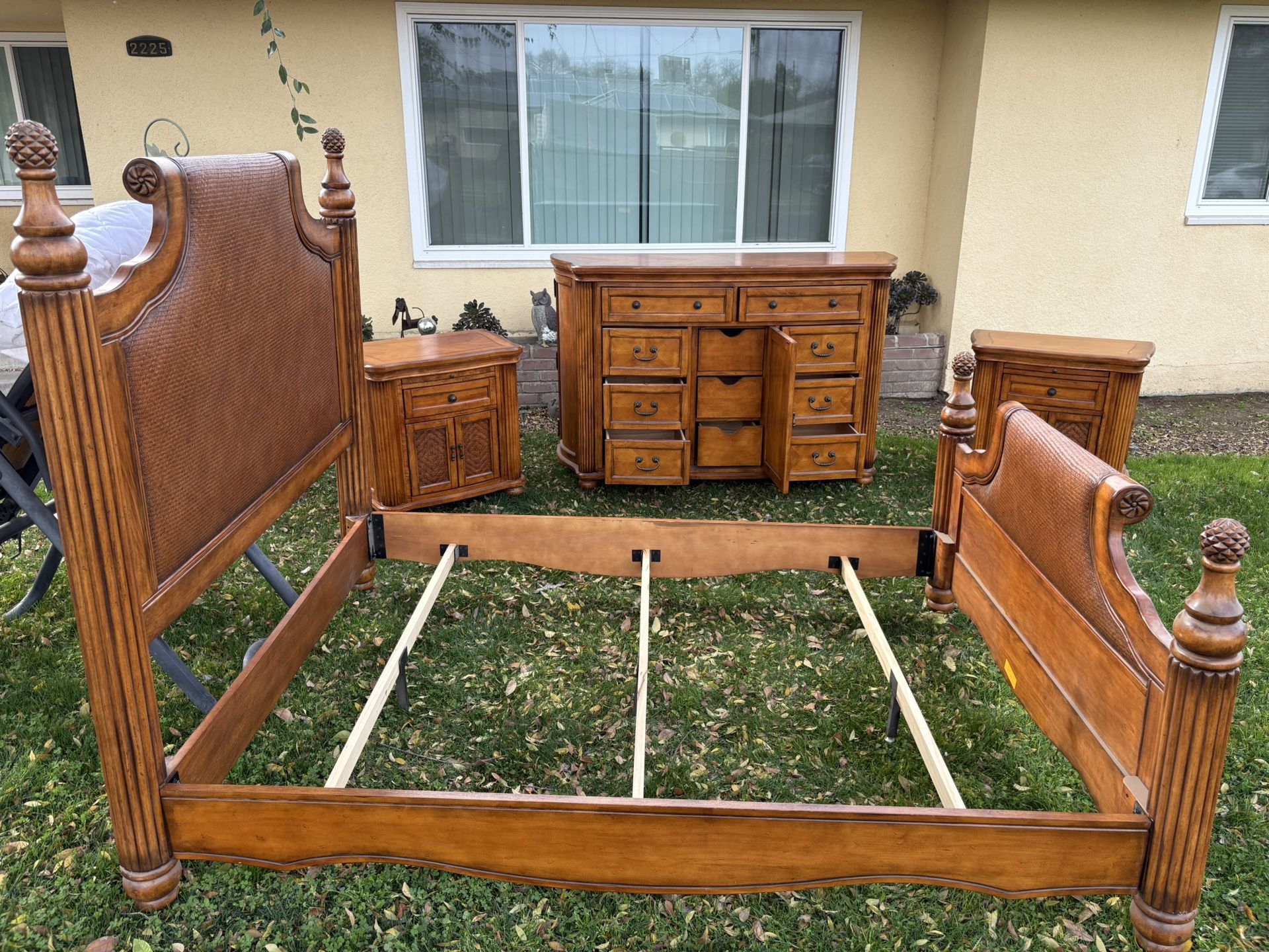 Beautiful bedroom set that includes a 11 drawer dresser with 2 side cubbies, 2 night stands and a nice queen bed( headboard footboard and rails) all for 550.