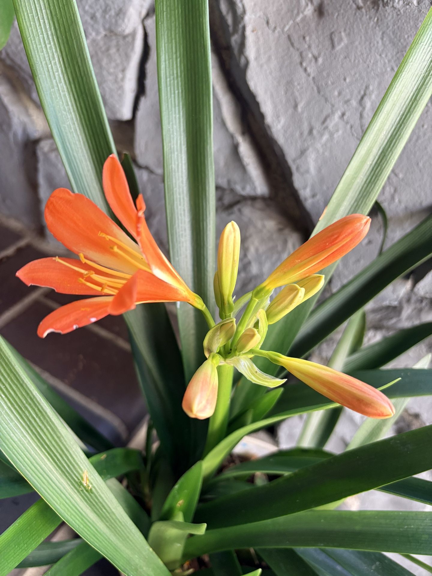 Blooming Clivia, also known as bush lily plants. There are a total of 6 plants in this pot. Can be divided and separated into multiple pots.
