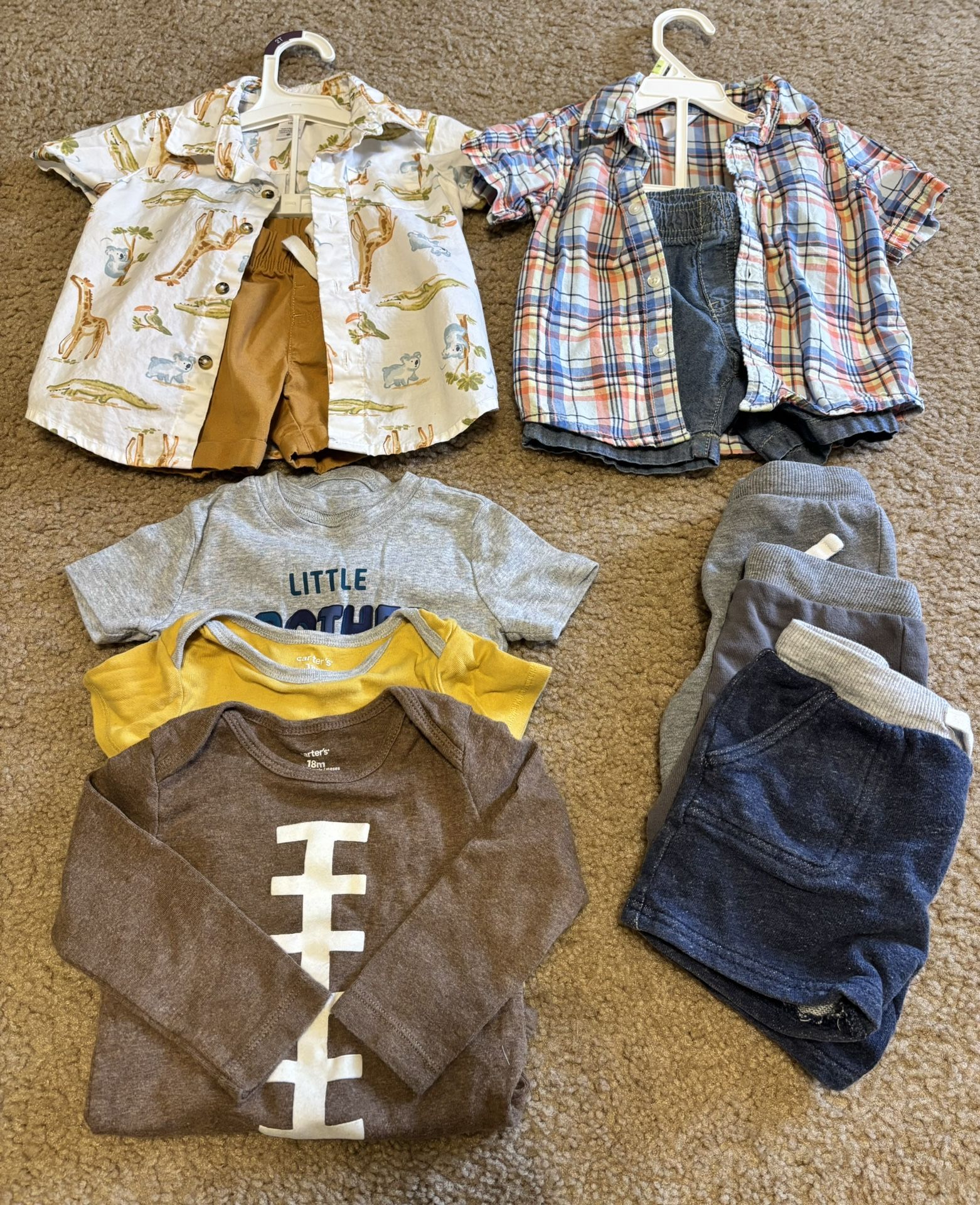 This bundle includes: -(2) short sleeve shirt and short sets -(1) long sleeve onesie -(2) short sleeve onesies -(3) pairs of shorts This bundle is great for the spring/summer weather! All have been checked for stains. The only stain found was on one of the shorts- green paint from a school project that wouldn’t come out.