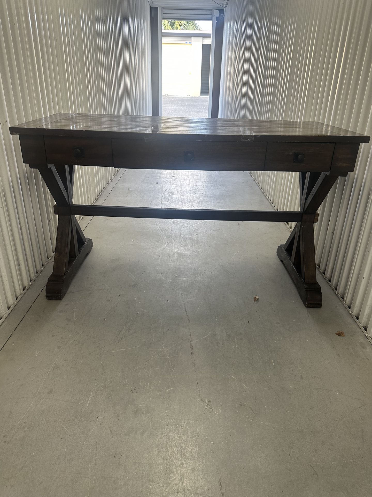 For sale is a solid wood desk with a rustic, farmhouse aesthetic. This piece features a sturdy trestle style base and a spacious top, making it suitable as an executive desk, writing table, or even a large console table. It includes two functional drawers for storage, each with dark, round knobs. 1 drawer is larger and the other smaller. Condition: The desk is in good structural condition. The top surface shows signs of wear, including some scratches and minor cosmetic blemishes as visible in the photo, which adds to its rustic character. Key Features Style: Farmhouse, Rustic, Trestle Base Material: Solid Wood Color/Finish: Dark brown finish Features: 2 drawers with dark hardware Asking price is $90 obo