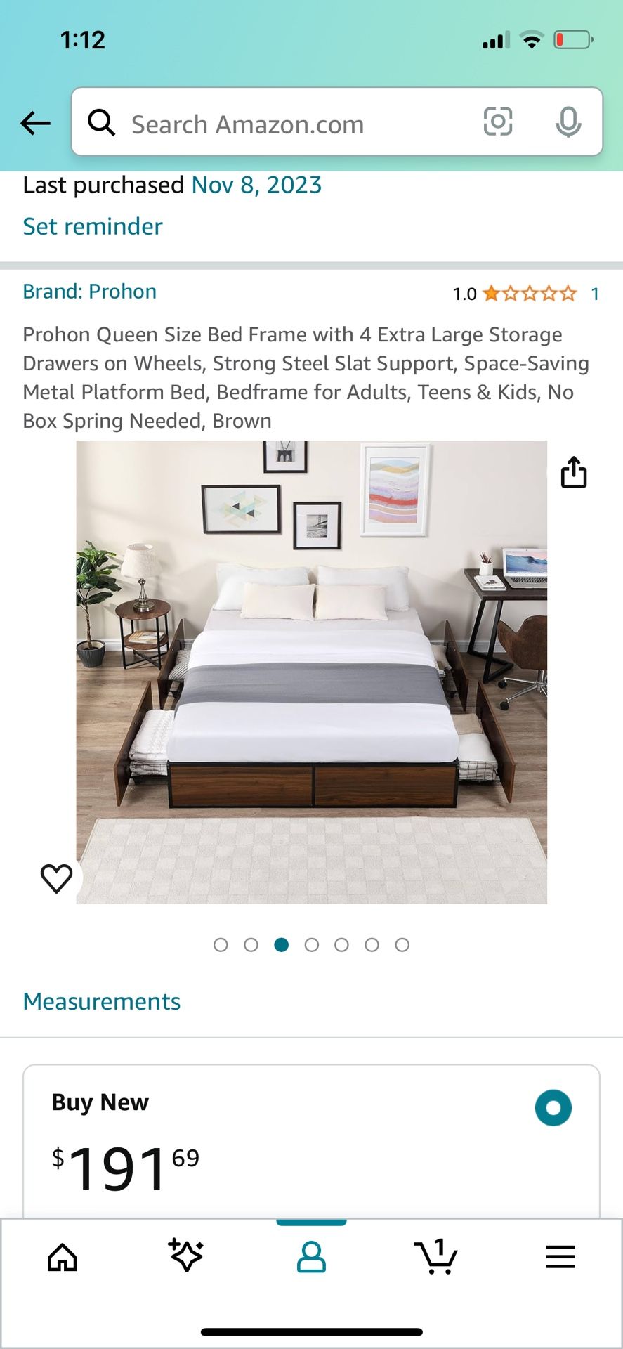 Queen storage bed with 4 drawers. That is new I bought it for the guestroom but I need it out ASAP because I purchased a new bed. It has only been slept on four times total since purchased in November.