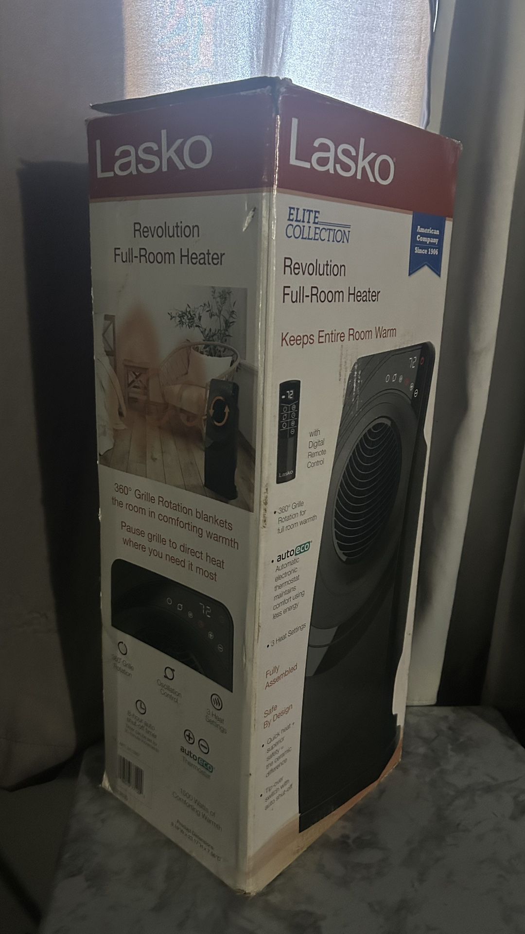 Lasko Revolution full room heater with digital remote control. 360 Grille rotation for full room warmth Fully in tact, Comes fully assembled, easy to use easy to understand etc