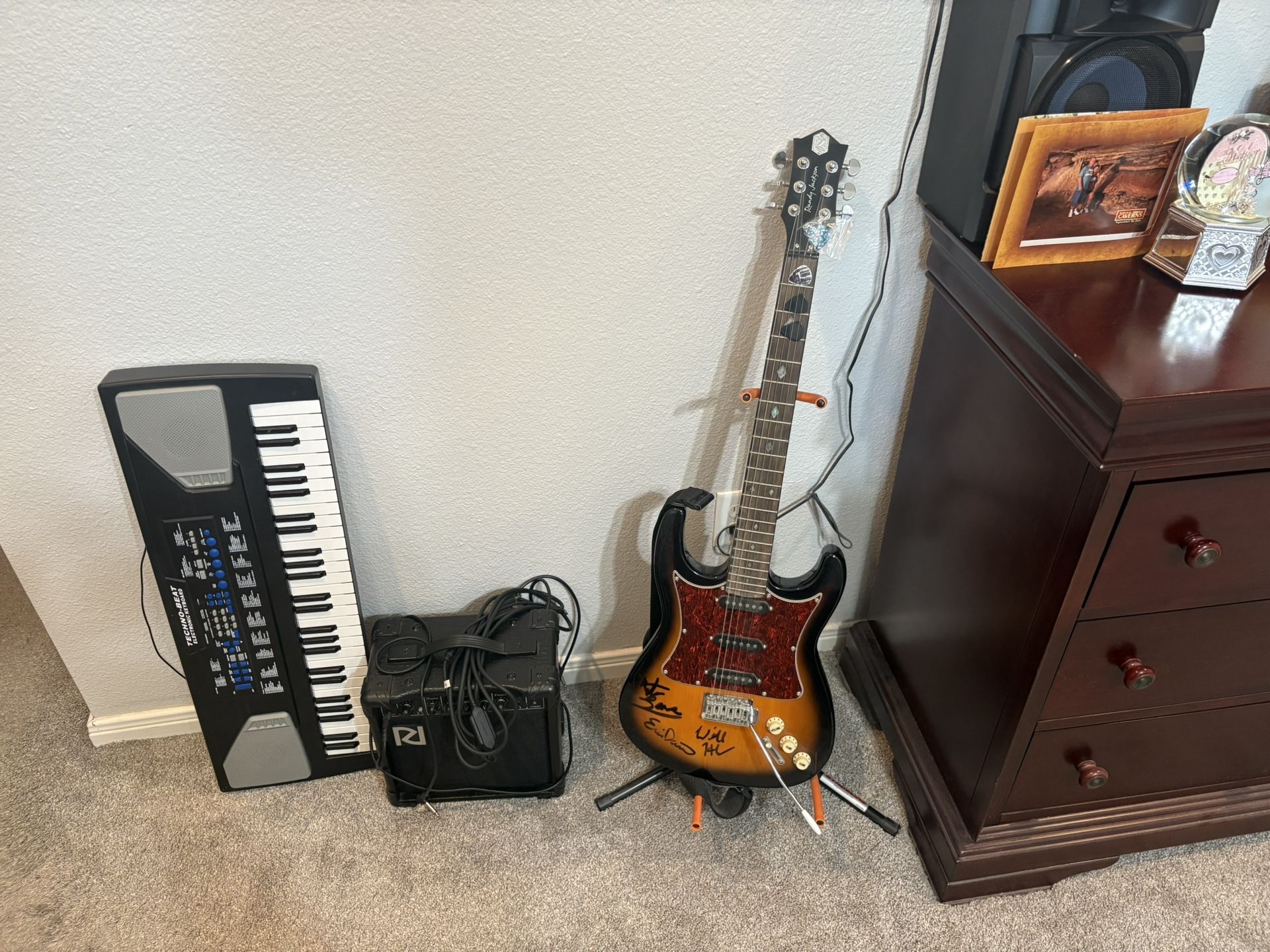 Electric guitar with electric power cord , speaker and guitar holders for the stage. Also comes with guitar case. All in very new condition . I only played it maybe twice but just lost interest .