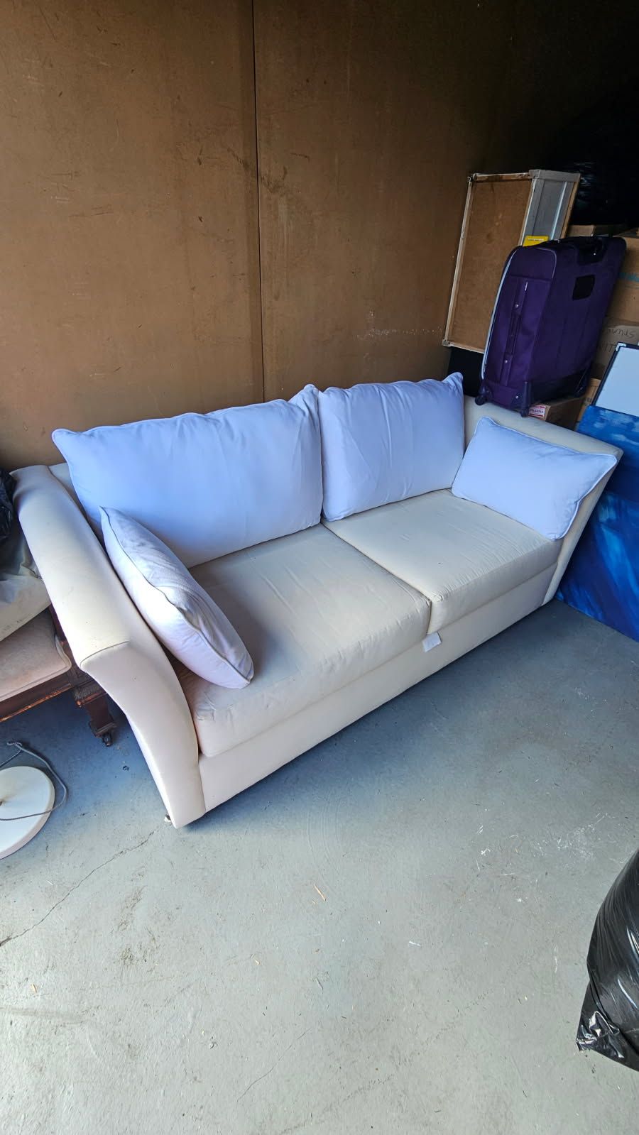 White slipcovered cotton Duck Tuxedo sofa 80w x40d. Slip covers shown on cushions. Great condition!
