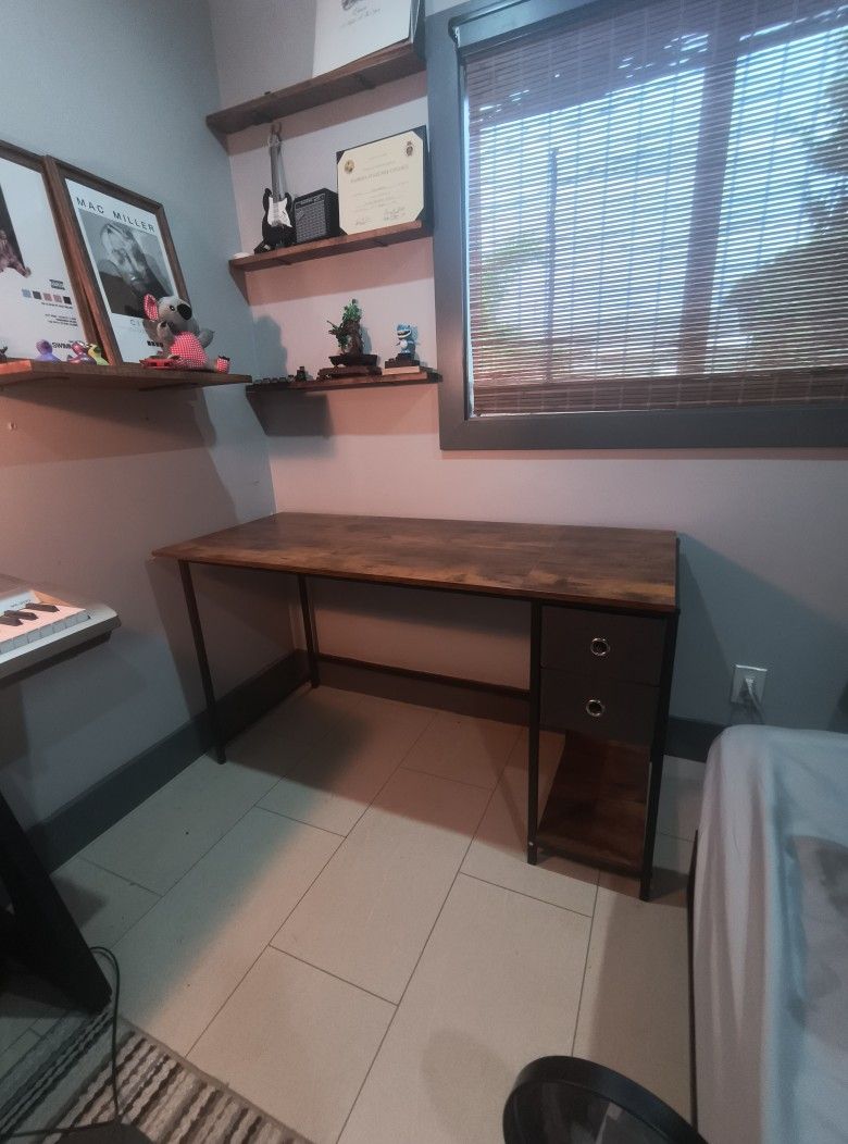 Wood and metal desk No wear or damage to desk surface Two cloth drawers Overall dimensions Depth: 24" Height: 30" Length: 55.5" Located near Forest Hill and 95