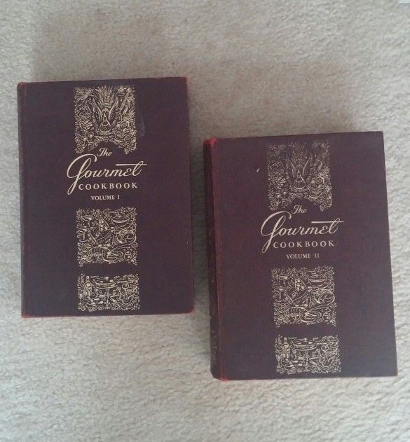 The Gourmet Cookbook/Two Volume Set. Illustrated with color photographs and recipes. Each book has more than 800 pages! Tips on cooking and dining accompanies many international recipes for hors d'oeuvres, soups, fish, poultry, meat, breads and desserts. The pages are in pristine condition. Hardcover binding has wear.