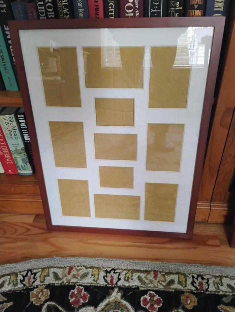 Aaron Brothers 19' x 29" collage photo frame. Solid wood with cherry finish. Can be hung vertically or horizontally. Has matte openings under glass for 11 photos or can be used as picture frame In excellent shape - 2 available. Price is for each. Discount for taking both.