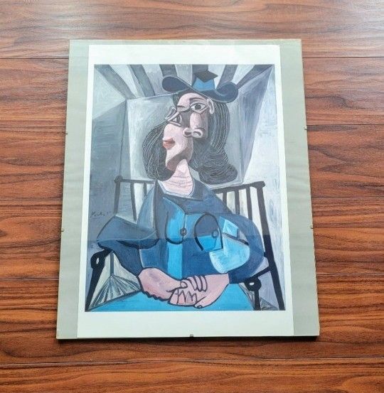 Pablo Picasso "Femme au chapeau assise dans un fauteuil" poster incased in vintage IKEA cork poster board with glass Measurements in photo Hardwire for hanging on the back Small chips at bottom corners