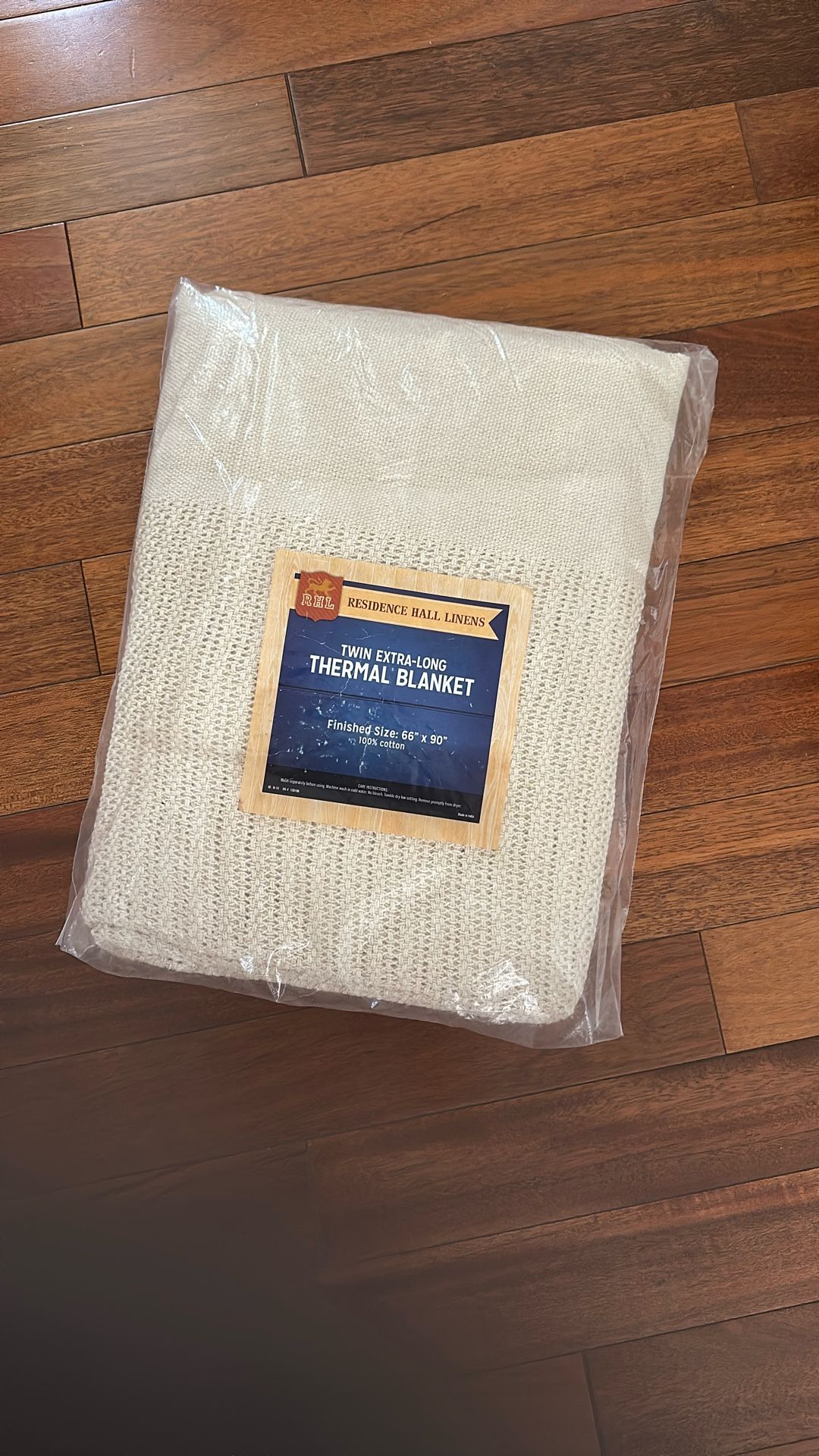 New twin XL thermal blanket for home or dorm room. Still in the bag, never opened. 100% cotton. Measurement: 66“ x 90“.