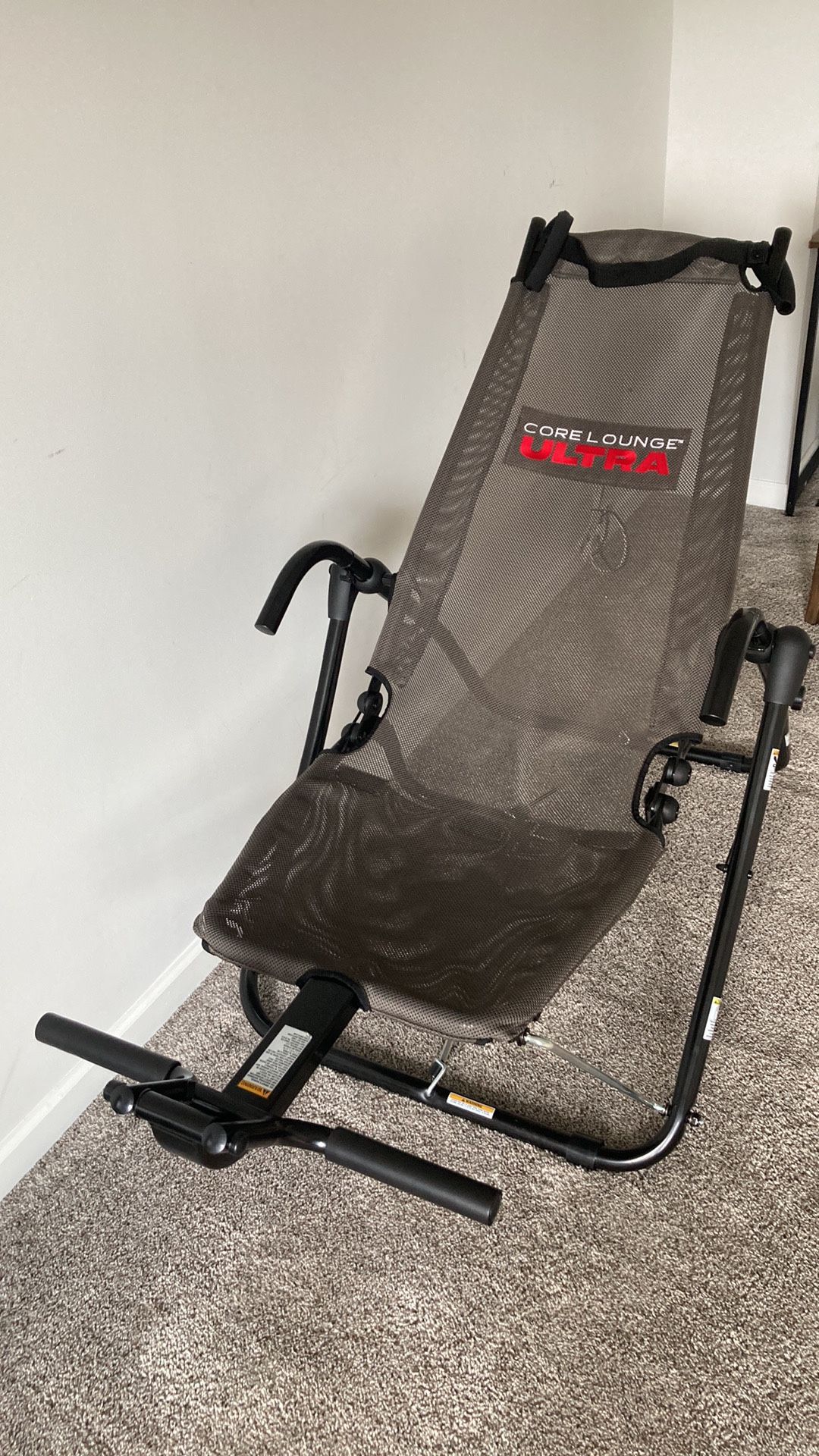 Description FITNATION Core Lounge Ultra workout chair. The full-body supported chair extends over 180 degrees and folds to simulate crunches. Comfort handles and custom foot grips help you maintain proper form while you work your way toward a better fitness routine. Features & details Full-body support Extends user body beyond 180 degrees Comfort grip handles Custom foot pedals Steel frame Measures 28.2" x 18.7" x 8.5", weighs 38.5 lbs; supports up to 250 lbs