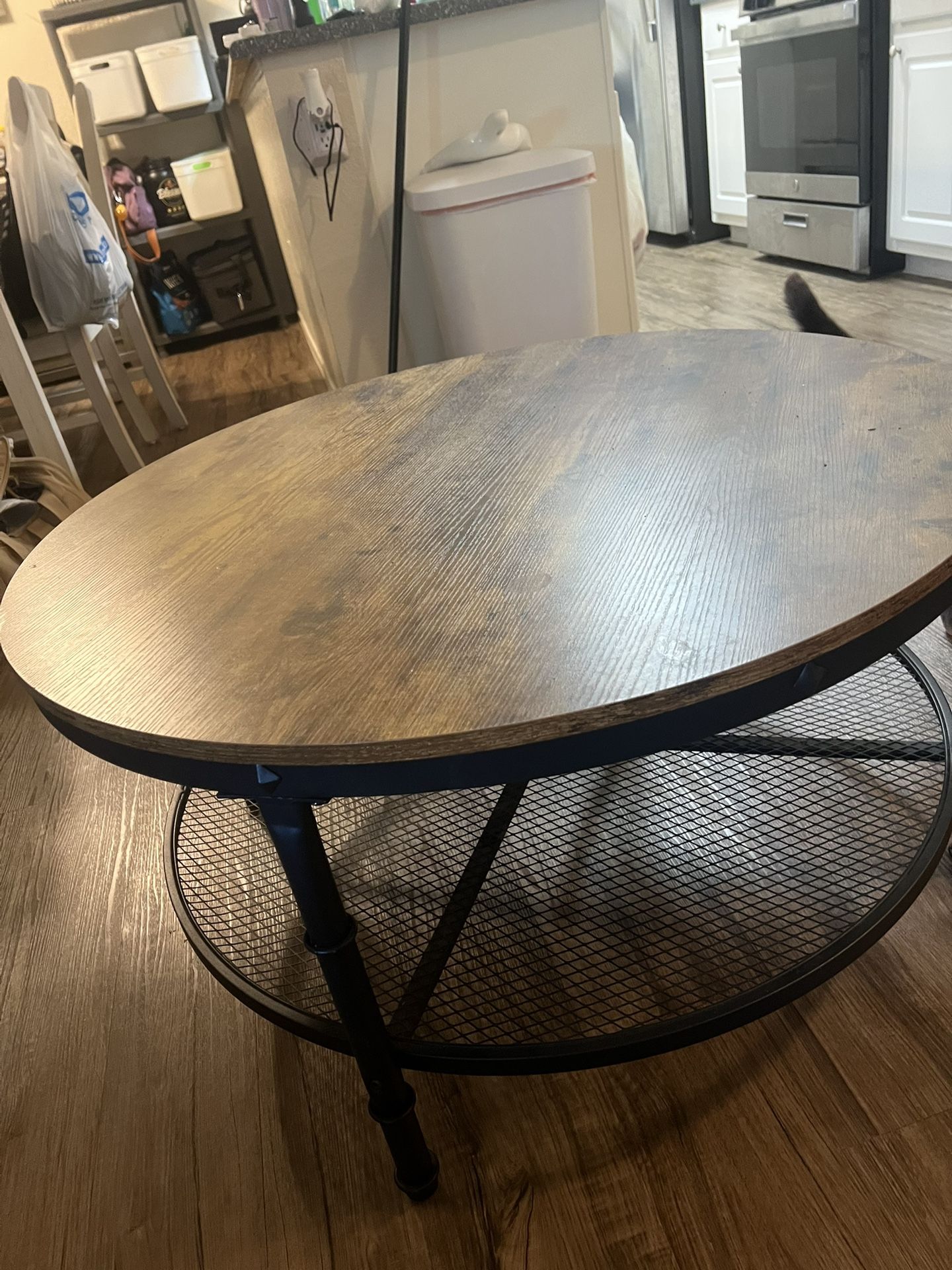 Round two tiered coffee table. Brown wooden top and black metal rack/legs. Lightly used but very sturdy.