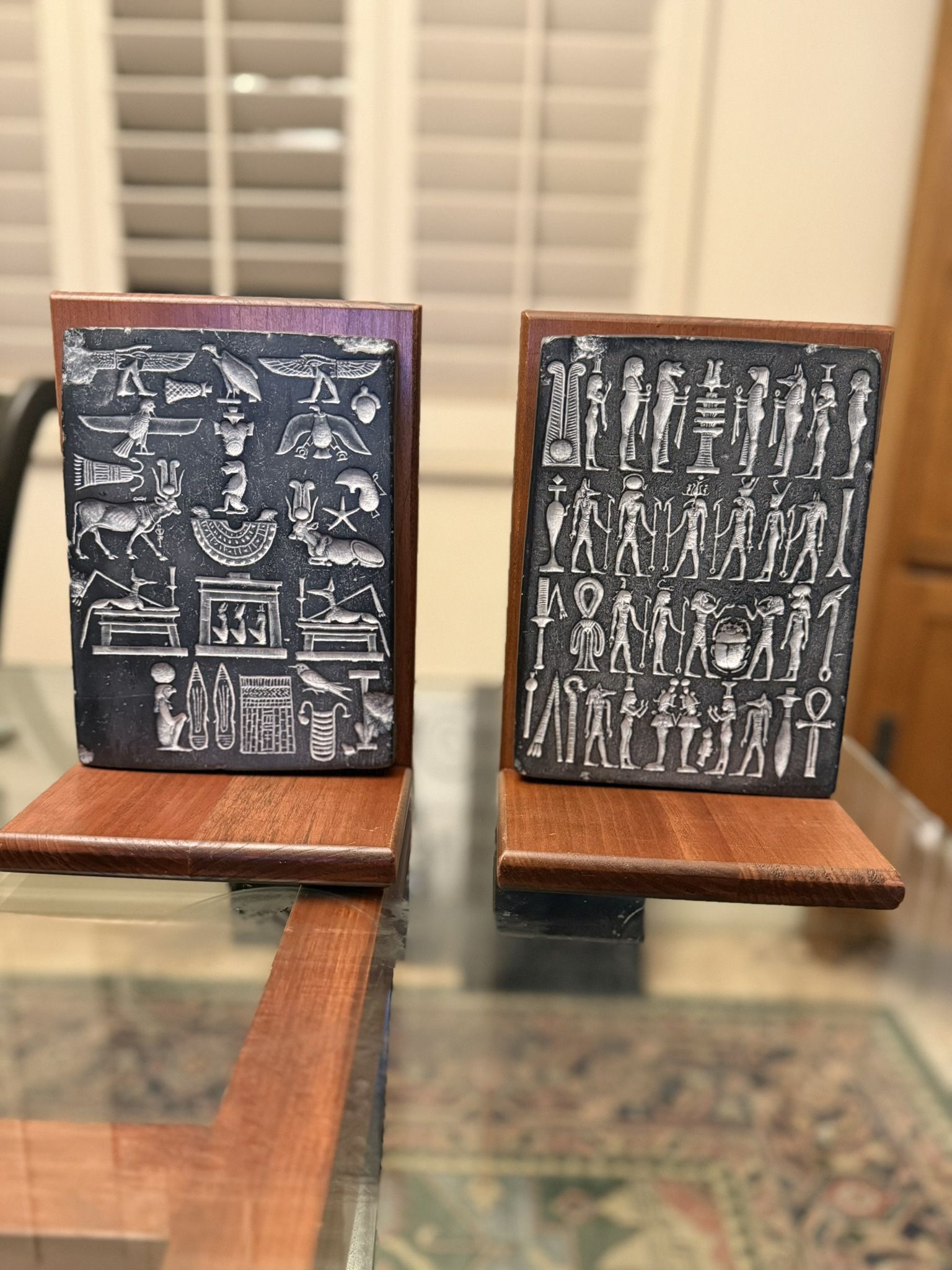 Price: $65 for the pair (open to reasonable offers) Beautiful vintage Egyptian-style bookends, sold as a matching pair. These feature detailed raised relief scenes inspired by ancient Egyptian art, mounted on solid wood bases. They are heavy, sturdy, and fully functional as bookends, while also looking great as décor for a bookshelf, office, or study. These are vintage decorative pieces (not ancient artifacts) and have a great museum-style look. Condition is very good for age with normal light wear. Selling as a pair only. Details: • Vintage Egyptian Revival style • Matching pair of bookends • Solid wood bases • Cast relief fronts with detailed imagery • Great for home library, office, or collector décor Pickup in La Jolla. Cash Venmo Zelle.
