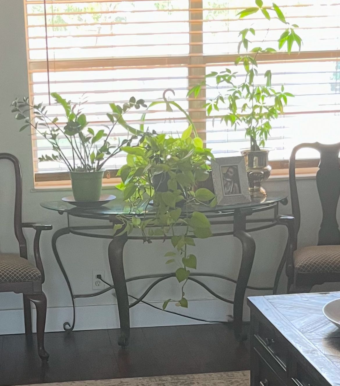 Beautiful & sturdy wrought iron foyer table with glass top. Plants are NOT for sale