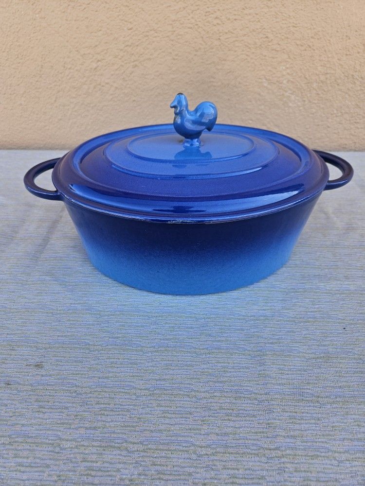 Selling a beautiful Staub Basix Round Cocotte (Dutch Oven) in a stunning blue ombre finish. This high-quality pot is made in France from durable enameled cast iron and features a unique die-cast stainless steel rooster knob. It's perfect for cooking and serving casseroles, stews, roasts, and more, going from stovetop to oven with ease. Material: Enameled Cast Iron Color: Blue Ombre Features: Oven safe (up to 500°F/260°C for the knob), made in France, excellent heat distribution Condition: Used, but in great condition as pictured. Minor signs of wear consistent with light use.