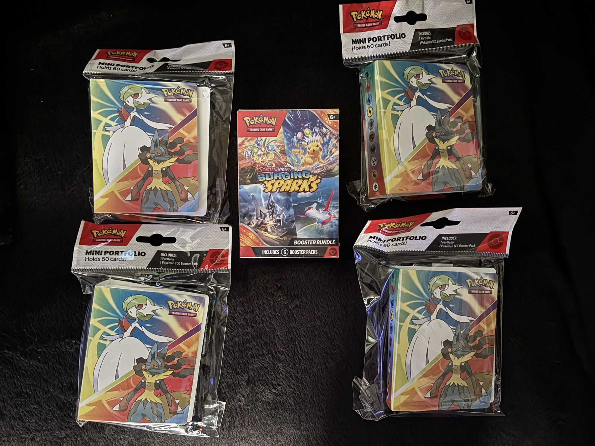 Pokémon Surging Sparks Booster bundle & 4 mega evolution mini portfolios $65 for all.