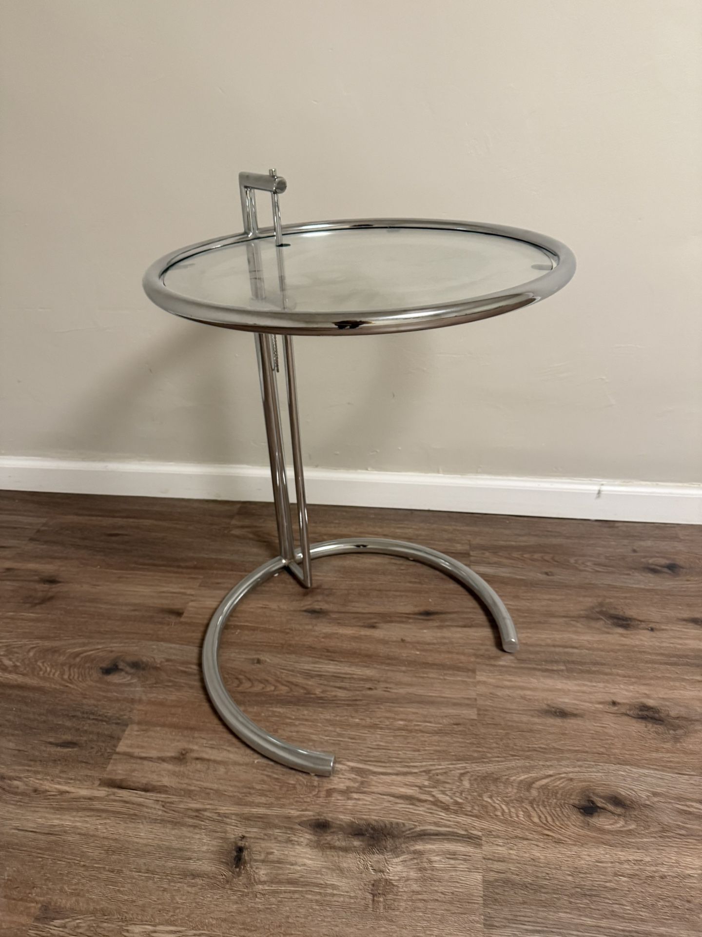 The height of this glass and chromed steel table is adjustable. Great condition with normal wear and tear. No chips on glass. Only Cash or Zelle accepted. Pickup in the Bronx.