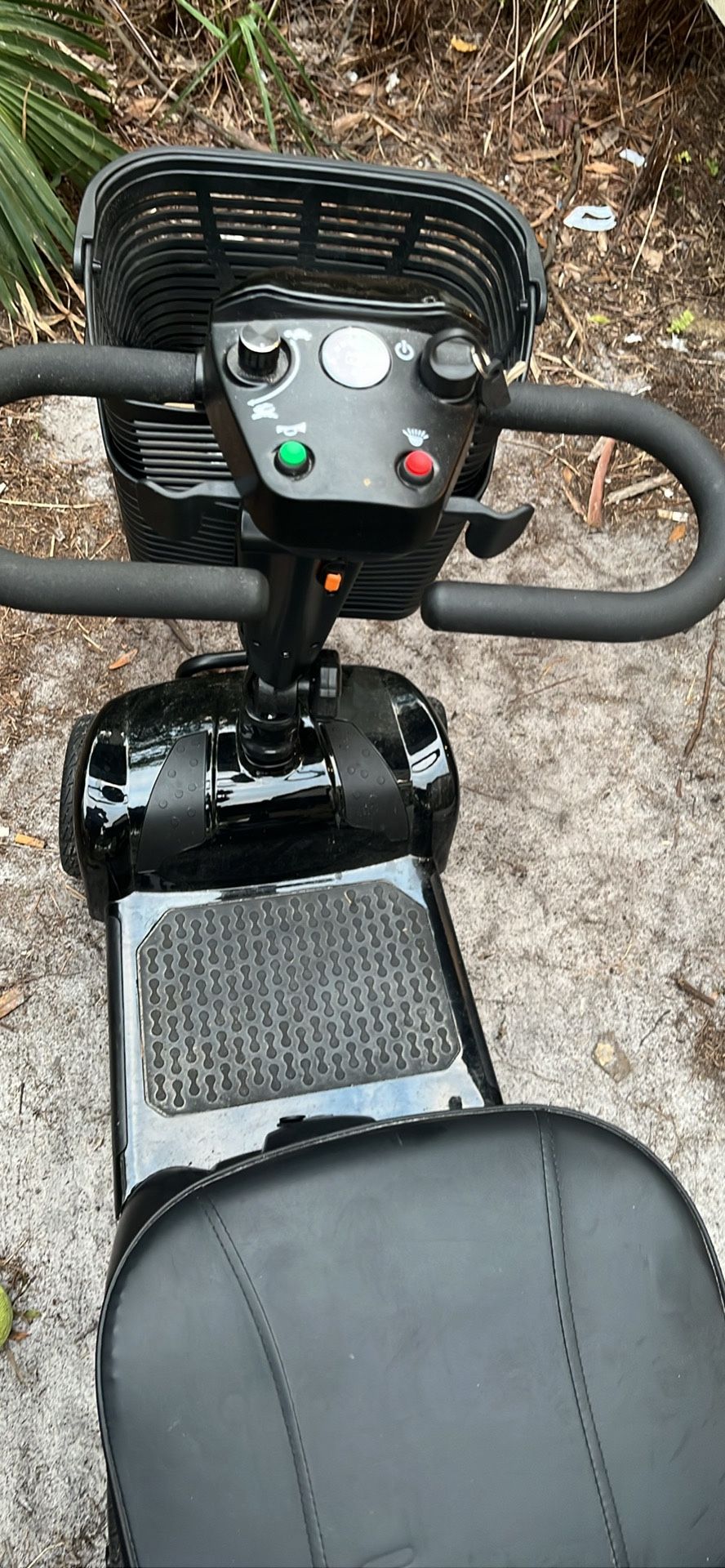 Brand new mobilized scooter, easy to fold up very compact has a basket you can put in the front and in the back, but they’re also removable has a cane holder. It can go slow or I can go pretty fast for a scooter has a light has a horn brand new never used