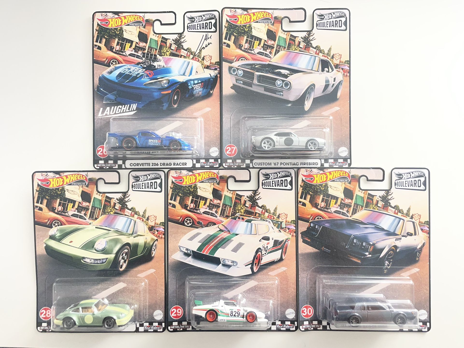 Hot wheels boulevard 26-30 set Corvette Z06 Drag Racer Custom '67 Pontiac Firebird Porsche 964 Lancia Stratos Group 5 '87 Buick Regal GNX
