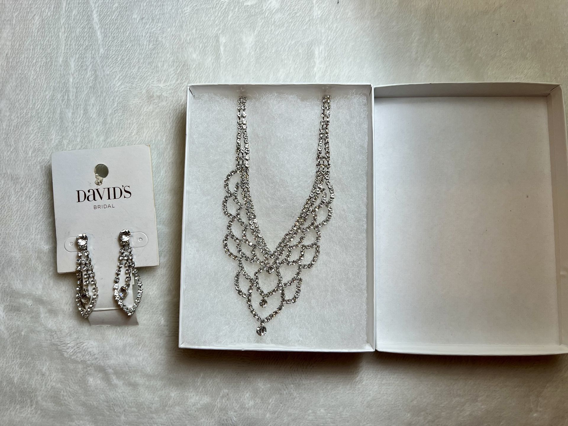Jewelry purchased from David’s bridal. The necklace was worn once, the earrings are brand new. Please tap to view each photo in its entirety. Feel free to ask questions about this item and please check out my other items, thanks!