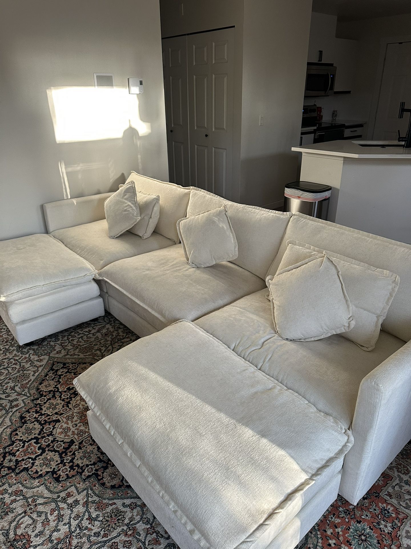 111.5 Inch-U I’m currently moving so I’m trying to get rid of it as fast as possible. The covers can be removed and deep cleaned and it also comes with 2 additional ottoman. I’m asking $400 OBO