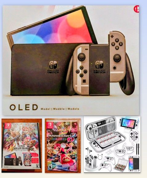 This listing is for 3 items: - Nintendo Switch OLED Model Super Smash Bros. Ultimate Bundle (limited edition, rare). - Mario Kart 8 Deluxe game - Accessory Deluxe Bundle Rare limited edition OLED; design inspired by the Super Smash Bros. Ultimate game. Everything needed, all accessories & Mario Kart game! 7” OLED touch screen with three play modes: TV, tabletop, & handheld. This Nintendo Switch OLED is barely used. It includes everything original it came with, including the cables, box, packaging, etc. Includes (also refer to photos): - Nintendo Switch OLED Console - OLED model dock (docking station) - 2 controllers: Joy-Con (L + R) Super Smash Bros. Ultimate (Limited Edition design) - wrist straps (2) - Joy-Con grips (2) - HDMI cable - AC adapter (Bought for my daughters, they used very little; then they got their first laptops & never touched the Switch again.) One physical cartridge game included: Mario Kart 8 Deluxe, purchased separately. Includes original case. Includes Nintendo OLED Accessory Deluxe Bundle (white color version, purchased separately), with original box/bags, including (also refer to photos): - OLED carrying case (white) - Protective case cover - OLED screen protectors (1 is already installed, 2nd new protector also included, with accessories) - 2 Joy-Con Wheels (white) - 2 grip cases/controller cases (white) - 2 TPU grip covers (4 total) (white) - 6 thumb grips (3 different pairs) (white) - Game storage case - Docking station for recharging, with USB charging cable (white) - Playstand (white) - Headset (headphones) - 2 touchscreen pens. A full factory reset (Initialize Console) will be performed on this Nintendo Switch. All personal data & accounts will be removed, ensuring it's ready for a new owner. The redemption code for the 3-month NSO individual membership has been redeemed, & it is not transferable; the membership offer will not be included. The download code for Super Smash Bros. Ultimate game has been redeemed; the game is not transferable after a factor reset; therefore, the Super Smash Bros. Ultimate game cannot be included.