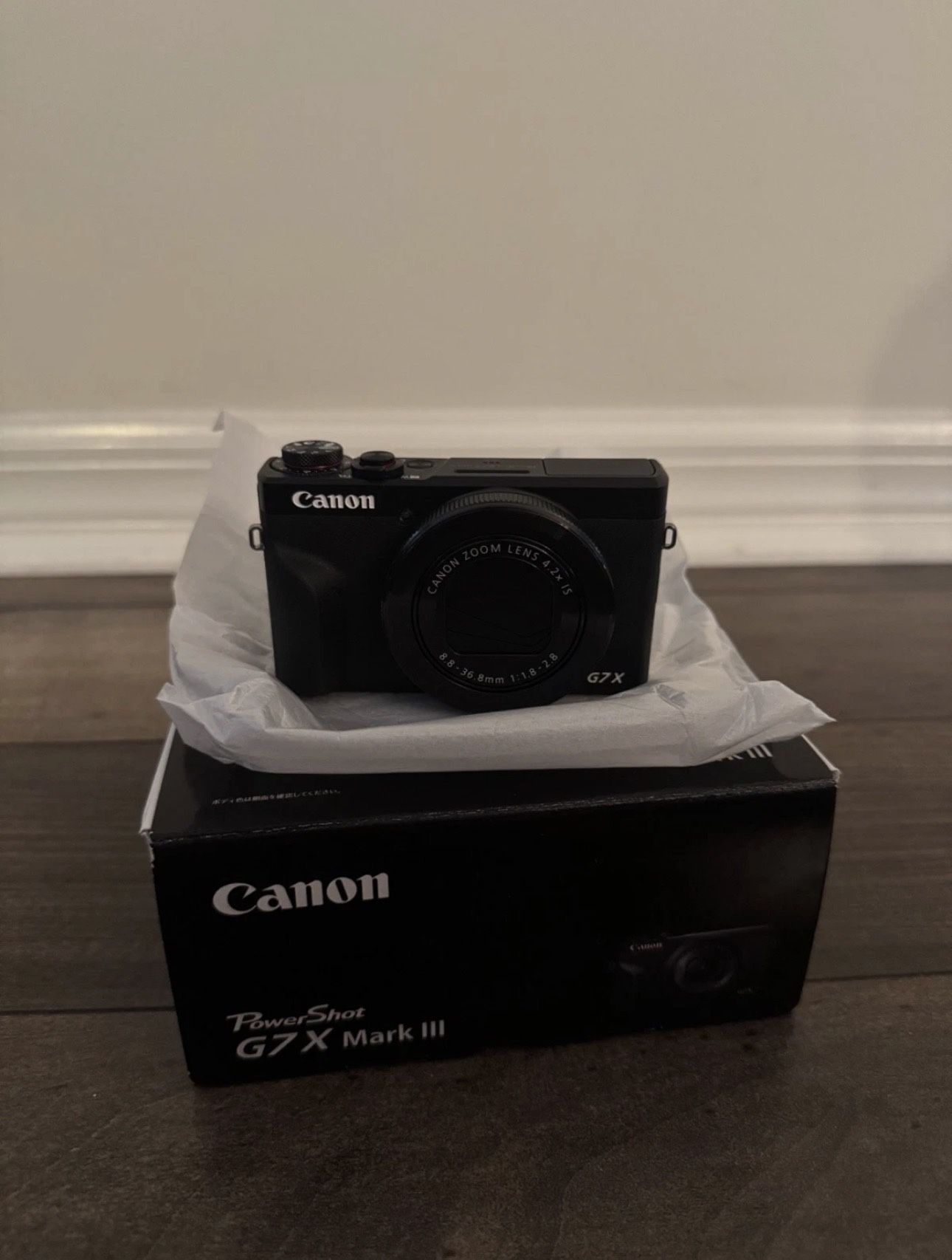 • Canon Power Shot G7 X Mark III (Black) • Original Battery & Charger • Wrist Strap • Original Box & Manuals Key Features: • 201 Megapixel 10" Stacked CMOS Sensor • 4.2x Optical Z0om Lens (24-100mm equivalent) with 1/18-2.8 aperture • 4K UHD 30p Video with no crop • Built-in Wi-Fi and Bluetooth for instant sharing • Flip-up touchscreen LCD — perfect for sellfies and vlogging • Live streaming support (Voulube ready) • High-speed continuous shooting (up to 20 fps)