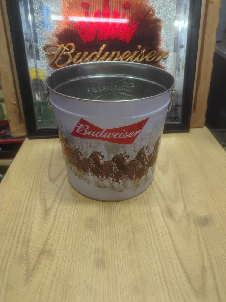 Approximately 3 gallon metal bucket with double logos.handles. good condition.