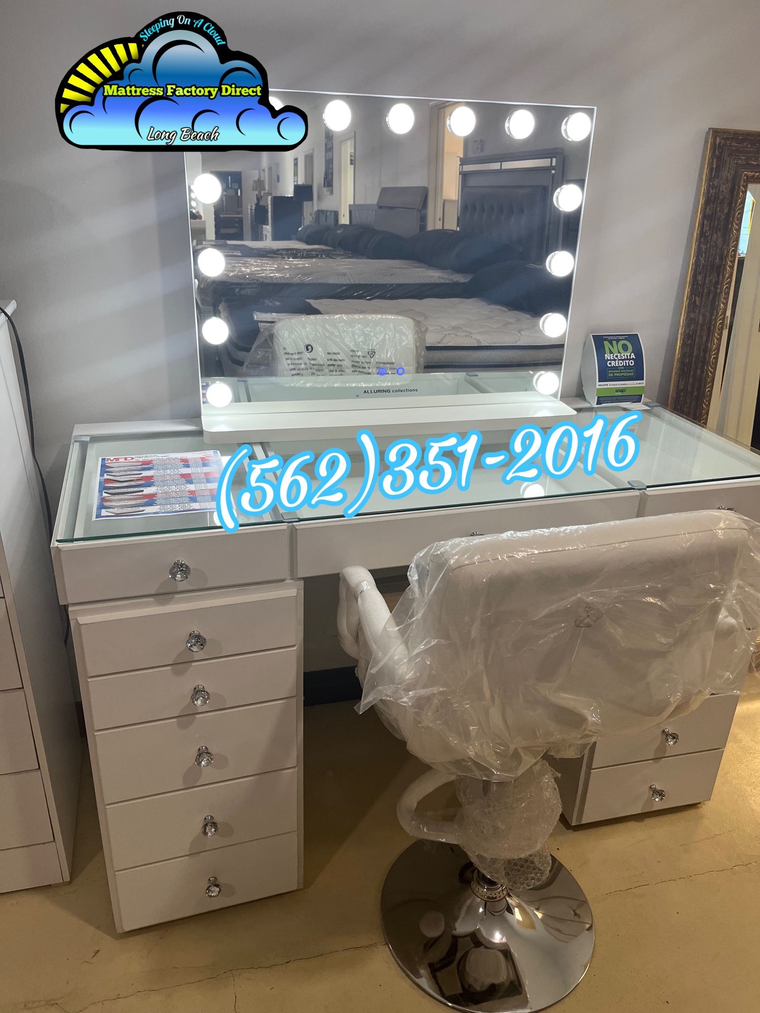 Vanity Desk White Glass top 13 Drawer Makeup Storage & LED Light Mirror
