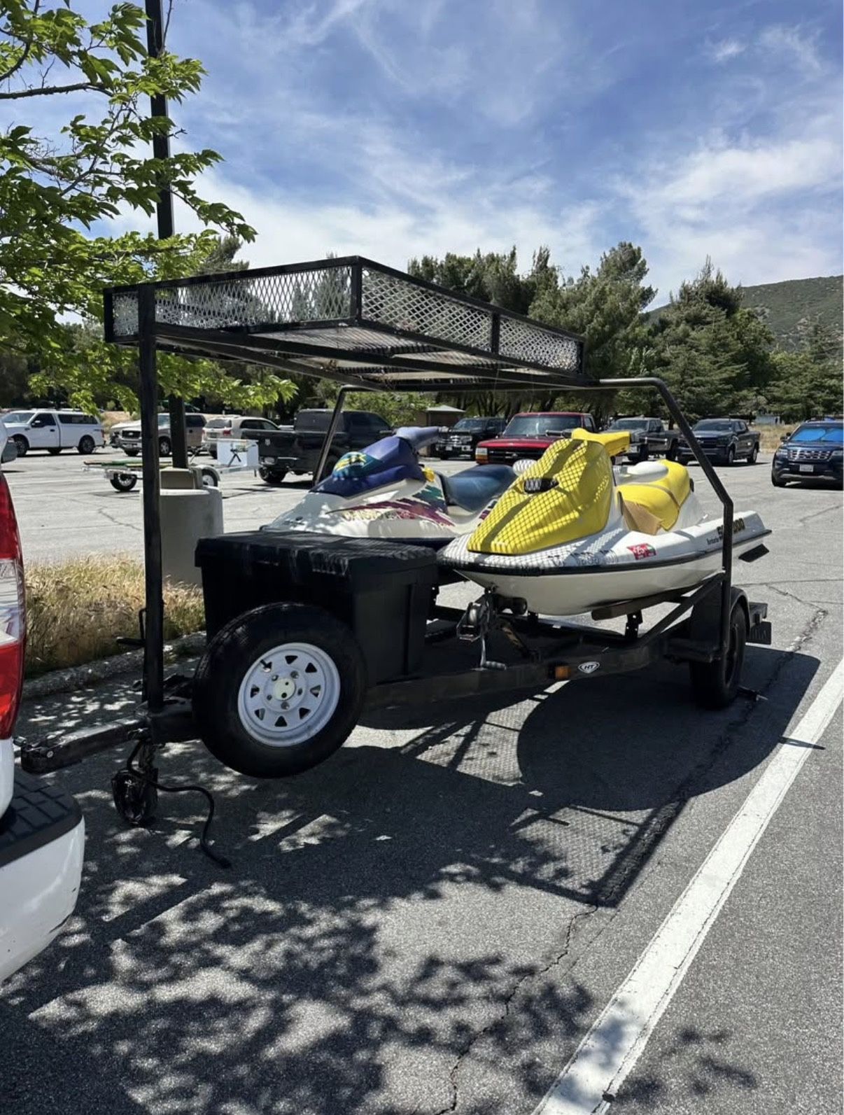 NEED GONE FIRST COME FIRST SERVE TODAY ONLY $1250 3/1/26 Originally selling for $5500 95’ Bombardier GTI - Yellow 3 seater, needs carb cleaning, upholstery needs work, 2 keys, clean title, pink slips in hand 96’ GSX - purple 2 seater, needs carbs cleaned, fun jet ski super fast and brand new battery purchased 5/2025 included, 1 key, clean title, pink slips in hand They have not been started. These are great for someone who knows how to work on them or is willing to take them to a mechanic to have them looked at. Again they worked 5/26/25 but have not been ran since. BOTH NEED CARB CLEANING Trailer - custom built trailer, cargo basket comes in handy, brand new and rewired lights, storage box for life jackets that are also included TRAILER ALONE IS WORTH $1500 Last taken out on Memorial Day 5/26/2025 Tags are up to date Seals on for Silverwood Lake Sold as is. Don’t ask me any questions just come look for yourself.
