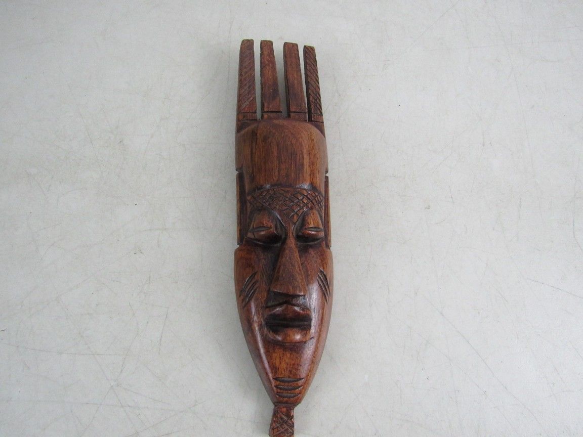 The African Tribal mask is 11 3/4" height X 2 3/4" width X 1 3/4" depth, and made of a hard wood. Good condition with some minor age and usage wear. No broken or missing parts. See photo's