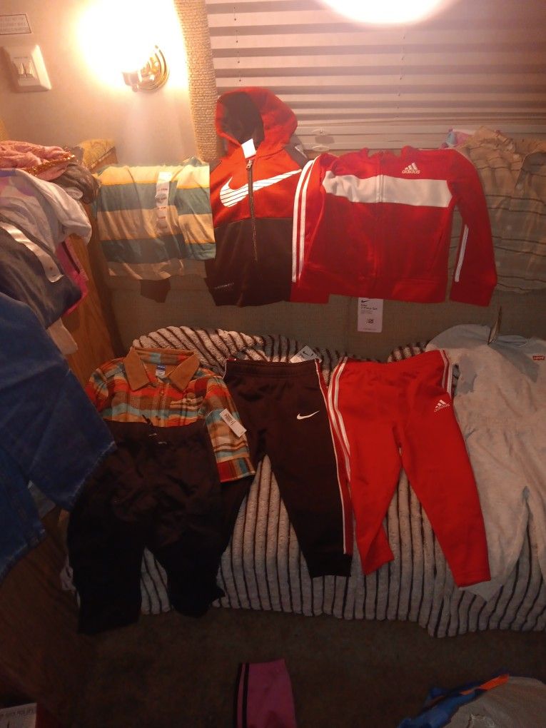 All brand new. Named brand outfits tags on everything still never warn. The nike 2 piece is 20 $ as well as the Adidas 2 piece. The Tommy Hilfer 3 piece set Is 30. The rest of outfits are 15 and shirts alone are 5