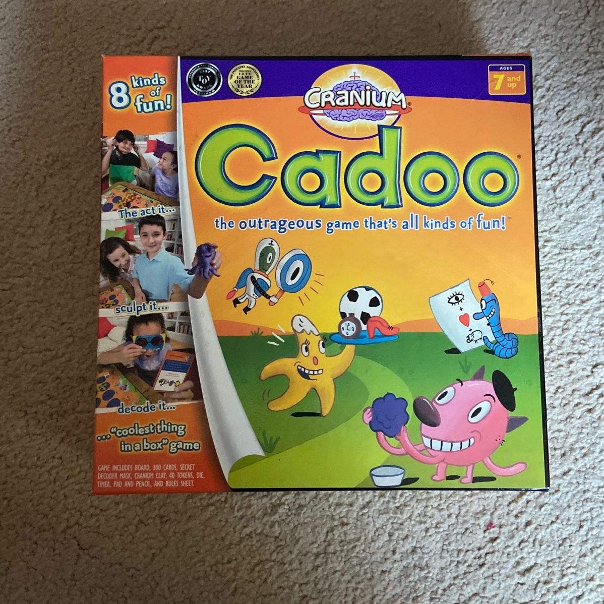 Great board game for kids ages 7 and up. 2 or more players. Oppenheimer toy portfolio best toy award platinum winner. Toy industry association game of the year winner. Last pix for reference only, not my pix. Kids can puzzle, sketch, sculpt, act out and cracks codes with the Cranium Cadoo Game. Includes: Gameboard, 2 deck of Challenge Cards, 1 custom die, 40 plastic scoring tokens, special red decoder mask, Cranium modeling clay, sand timer, sketch pad and illustrated instructions. For 2 or more players, ages 7+Cranium Cadoo Game. In very flood condition and from a smoke free home.