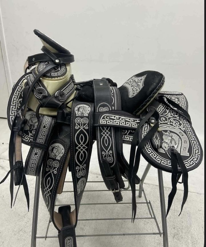 Hecha en México, 100% piel bordada con preciosos diseños charros exclusivos en toda la montura, el precio ya incluye la cabezada las correas para las espuelas, el cincho y la pechera, lista para recoger o entregamos a domicilio