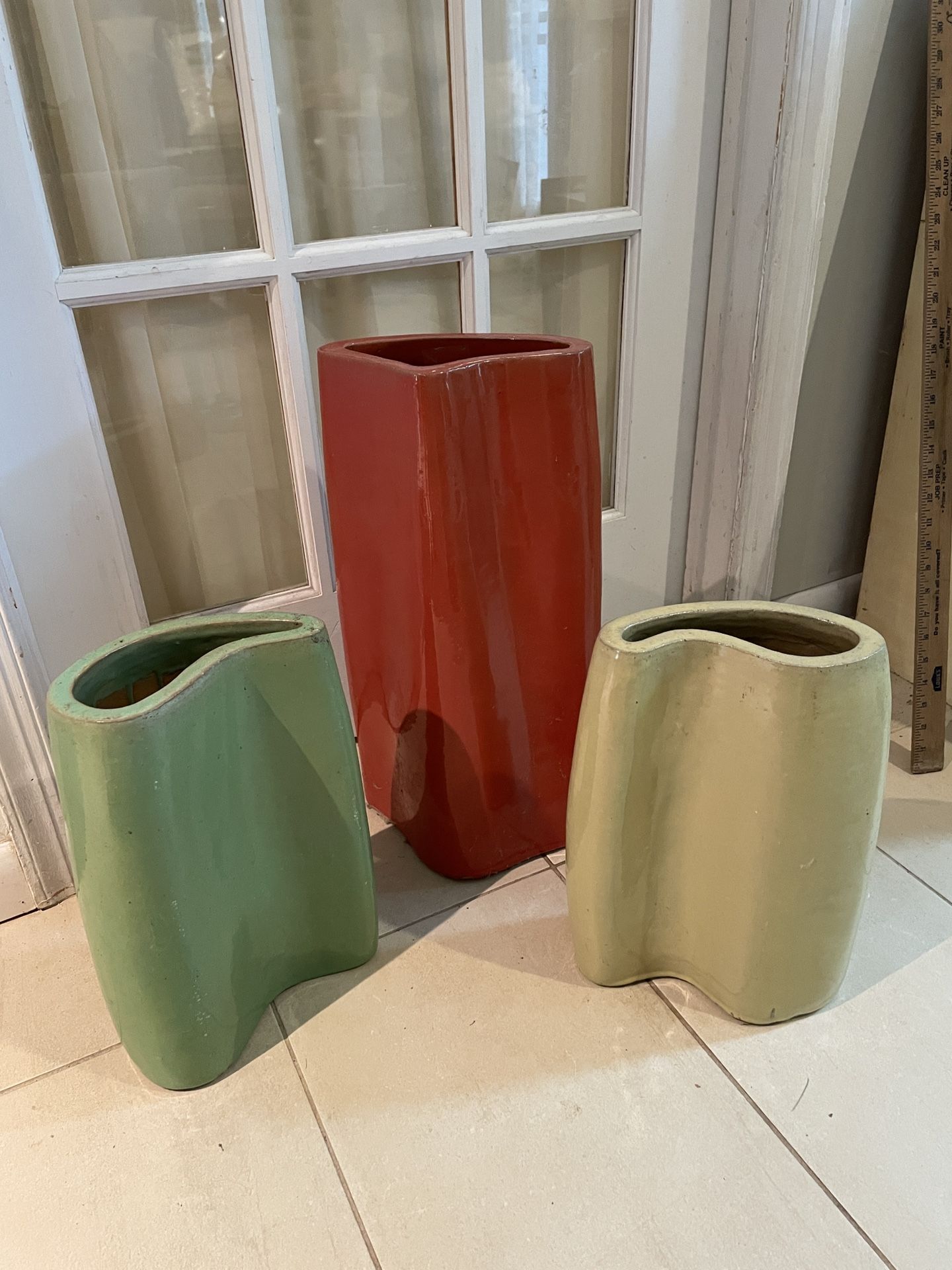 Large one is 20” high and about 9” wide. Two shorter vases are 14” high and about 8” wide. Will sell as a set only. Mainly decorative but also functional. These are more substantial than the pictures can convey. In VB near Haygood Shopping Center. Cash and exact change only please.