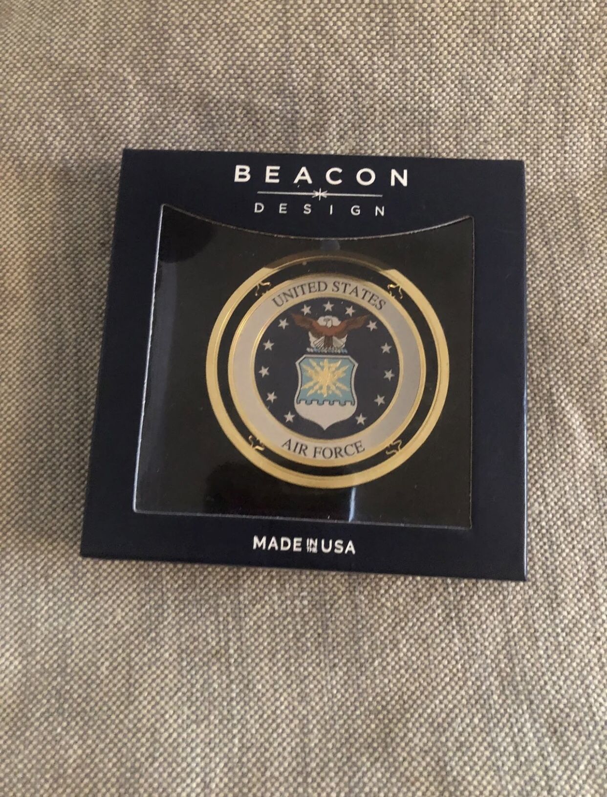 Beautifully handcrafted ornament made from solid brass and finished in 24 karat gold Screen printed with exquisite color Packaged in a decorative window box 100% made in the USA 2.93 x 3.01 x 0.01 inches