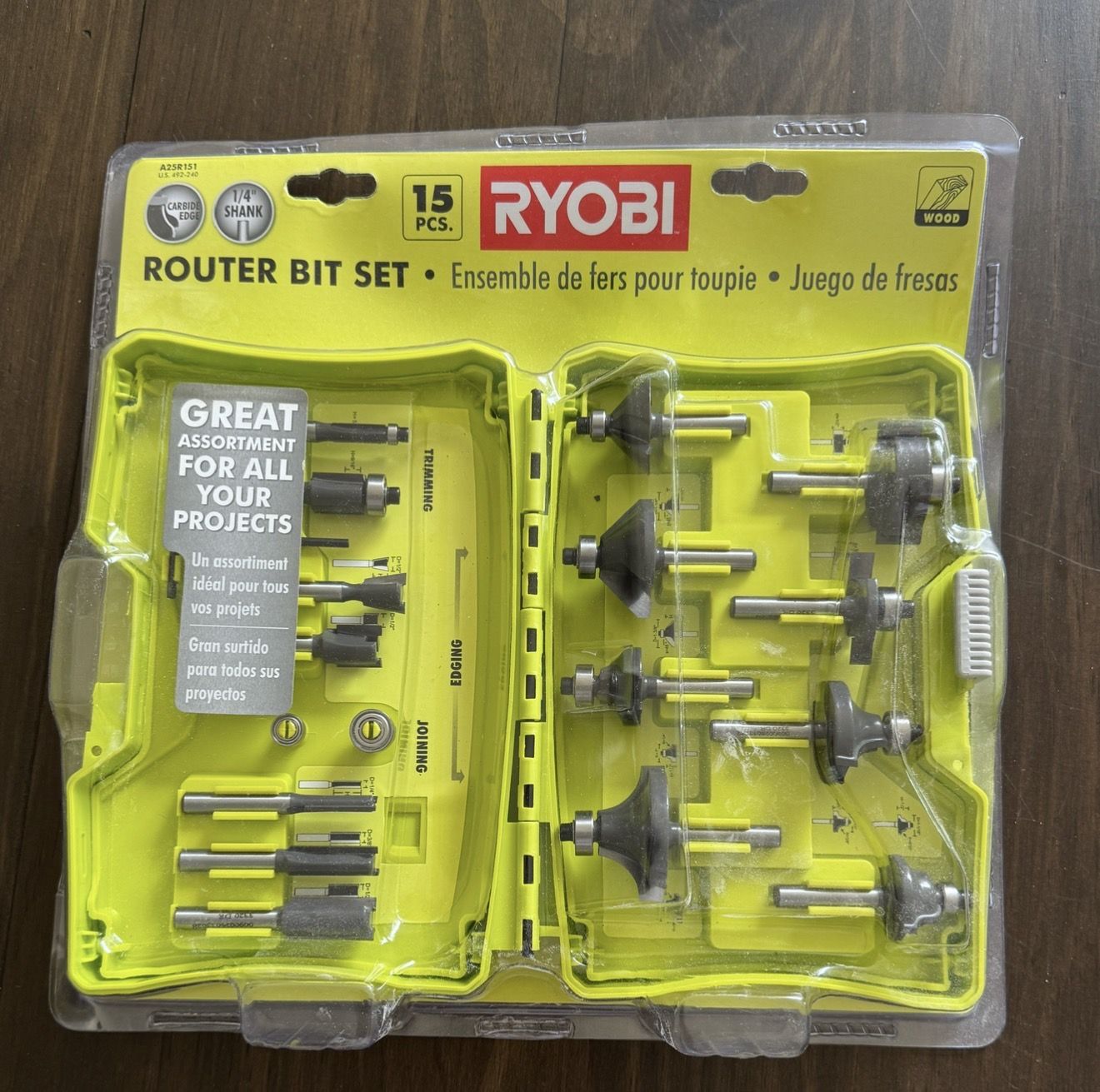 Ryobi 15-Piece 1/4 inch Shank Carbide Edge Router Bit Set (Model: A25R151). Included Components: 15 carbide-tipped bits designed for decorative edging, joining, and trimming, all housed in a compact protective case. Specifications: Each bit features a \(1/4\) inch shank and is designed to handle rotational speeds up to 30,000 RPM.